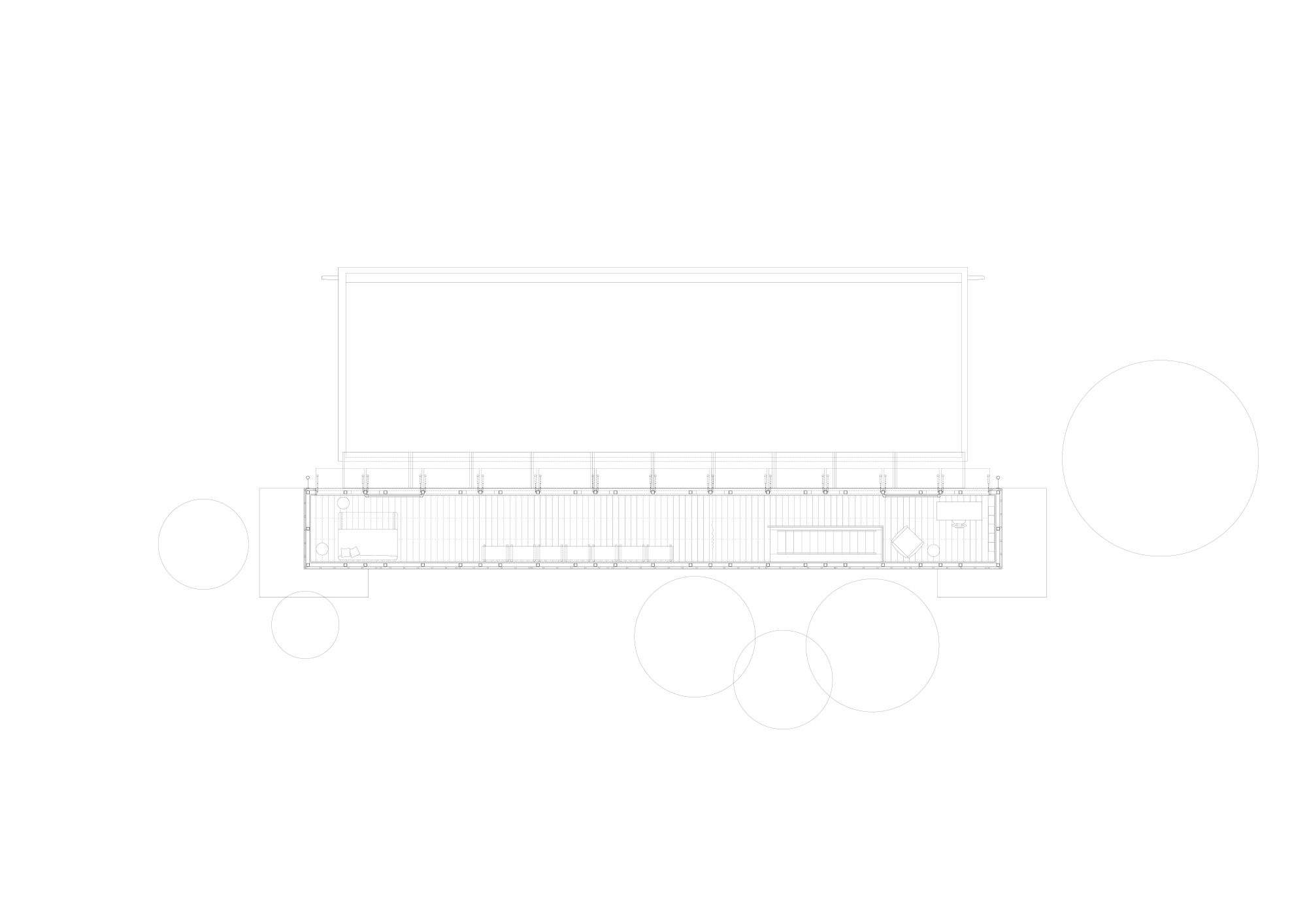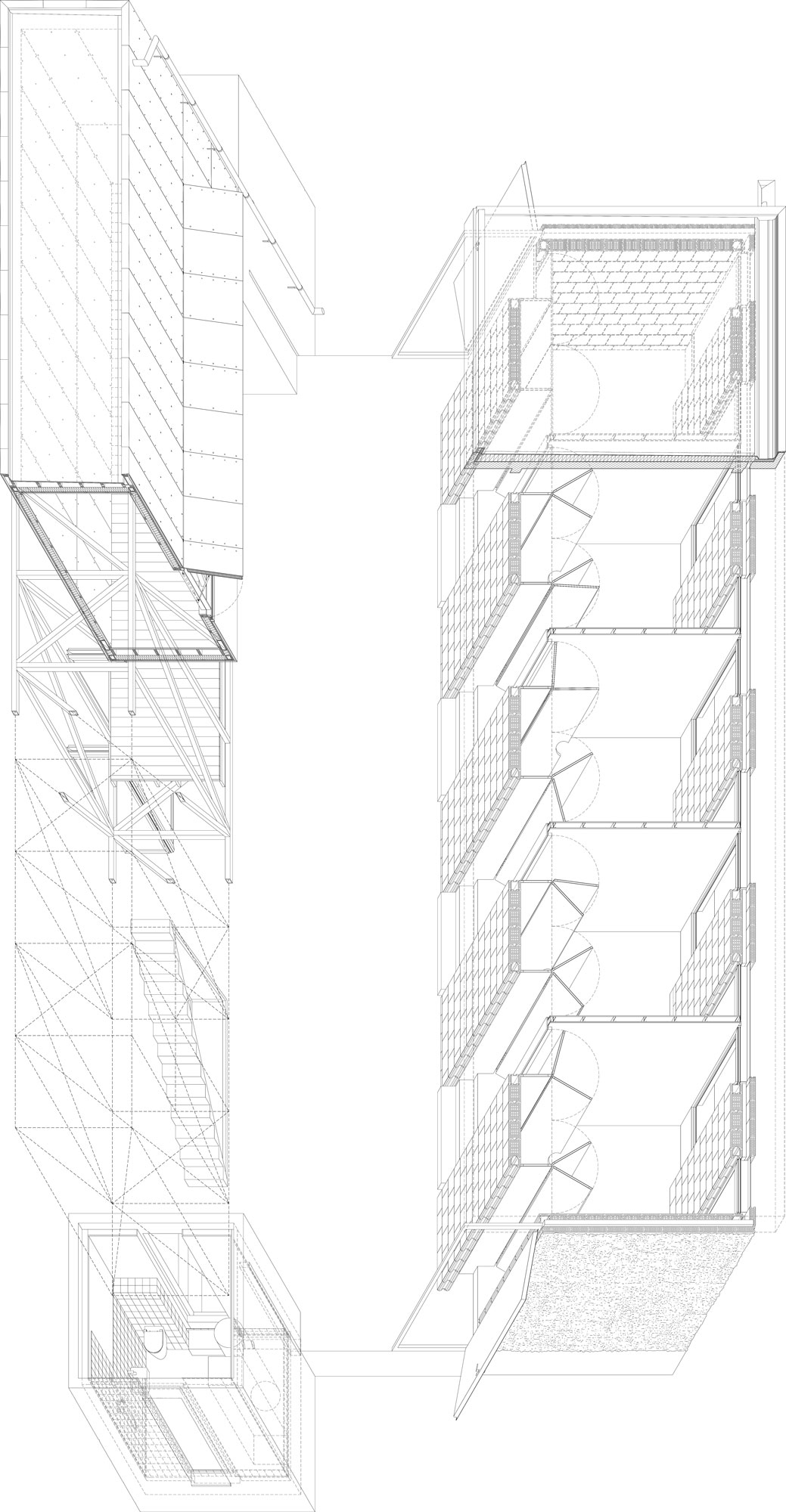 Izgrađena kao prostorna rešetka i obložena metalnim panelima sa spoljašnje strane i drvetom sa unutrašnje strane, ova struktura je istovremeno istaknuta i povučena koliko je potrebno.