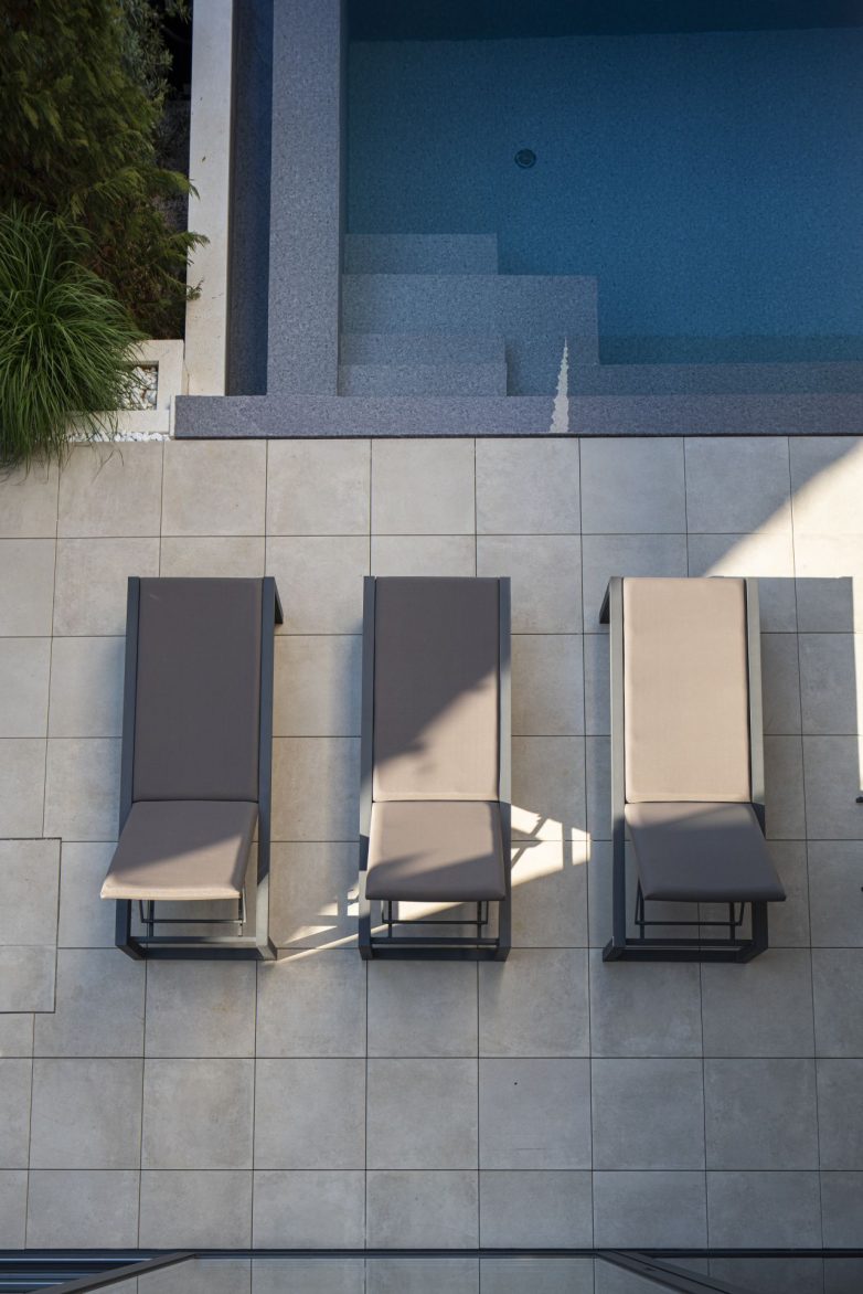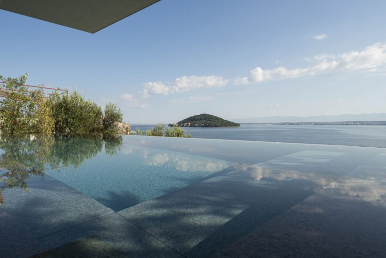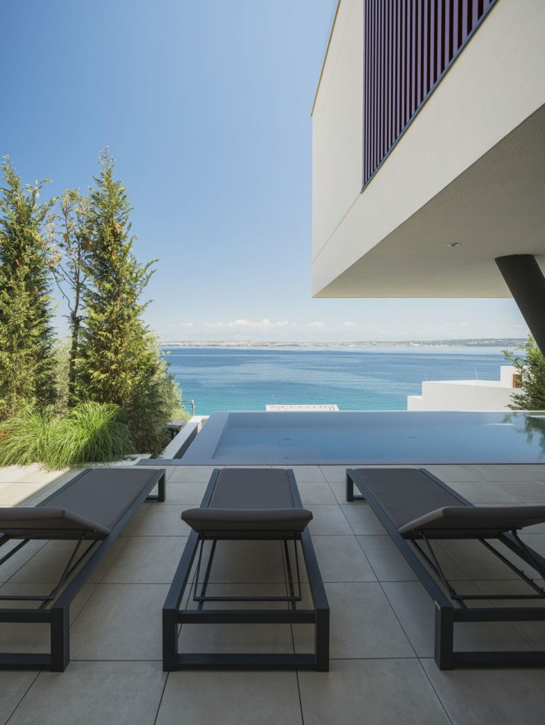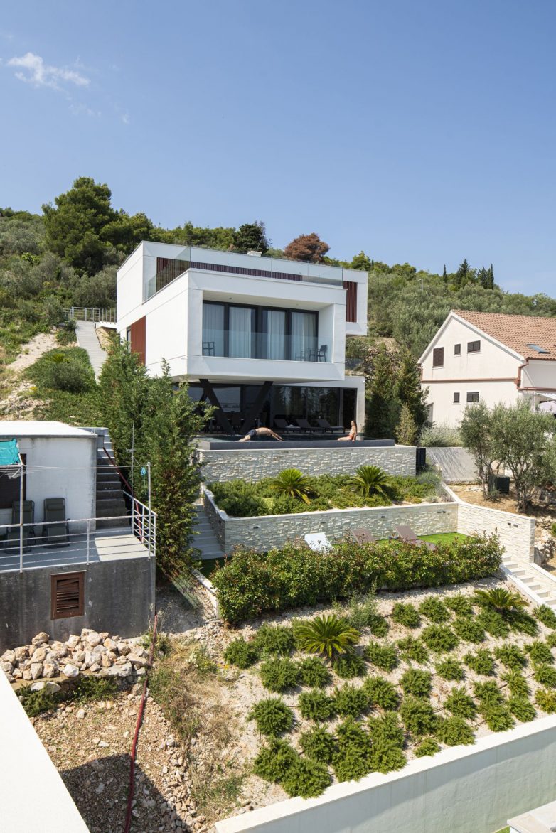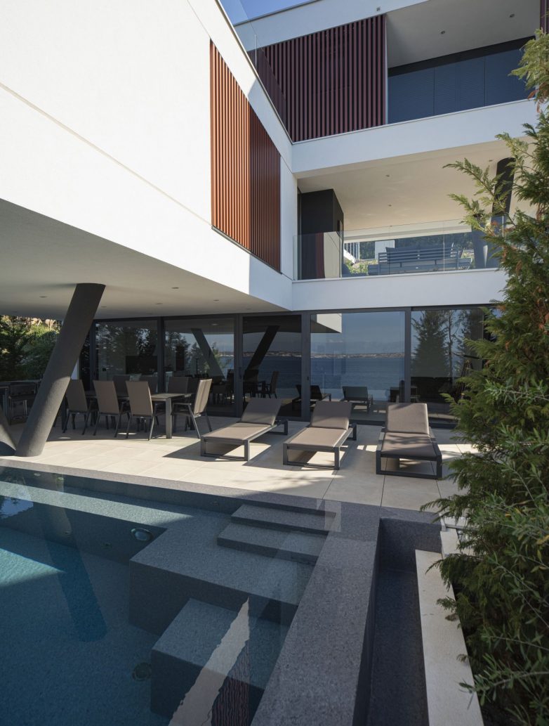 Velika strmina parcele omogućila je da svi novoformirani ambijenti budu obogaćeni najvećom vrednošću lokacije – vizurom prema moru i gradu Zadru.