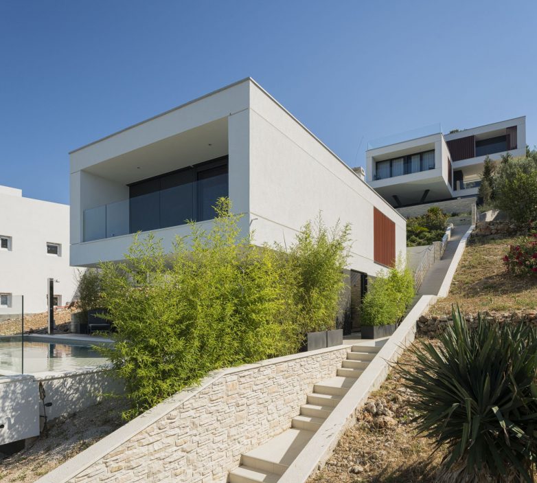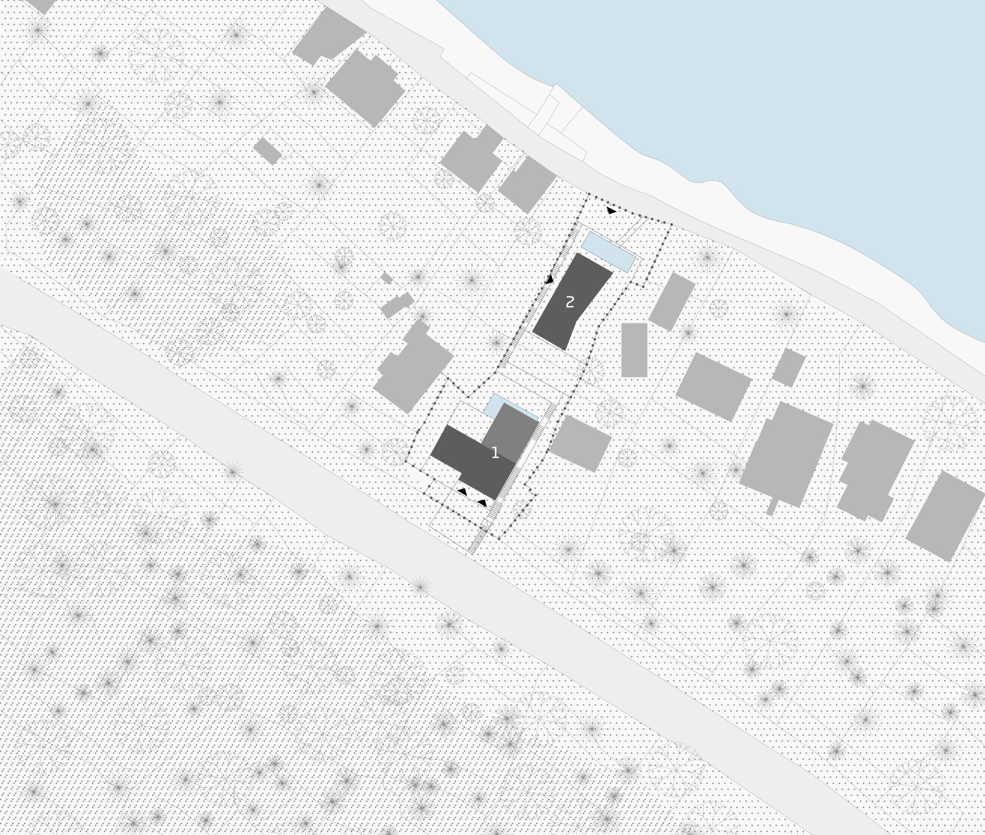 Ceo sklop je povezan stepenicama pozicioniranim tako da ne ometaju ostale funkcije, a omogućavaju pristup moru iz obe kuće.