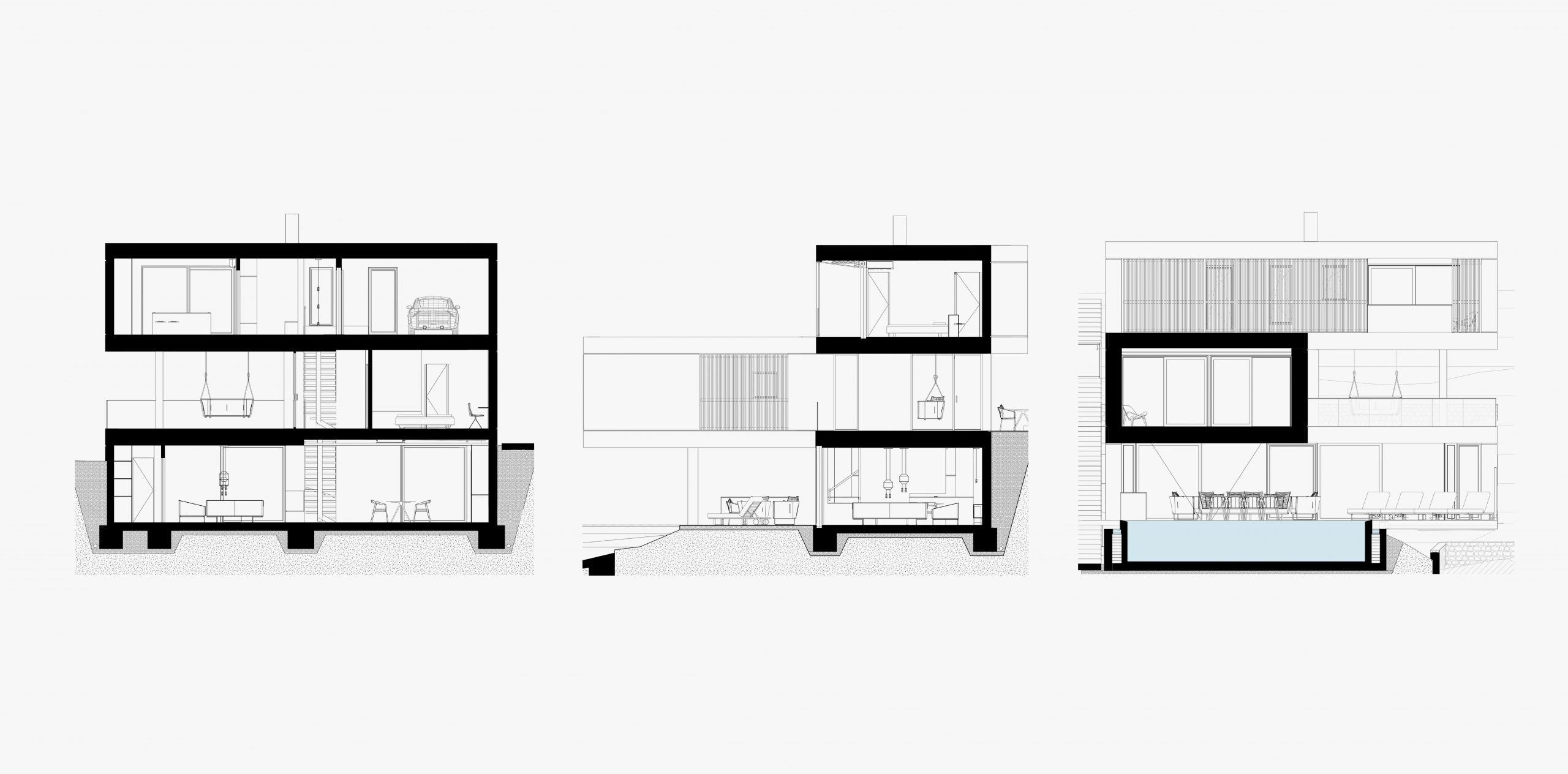 Relativno veliki volumeni kuća u odnosu na veličinu parcele usitnjeni su u tri približno jednaka kubusa, po kući postavljena tako da svojim međuodnosima stvaraju raznolike spoljašnje prostore prijatne za boravak.