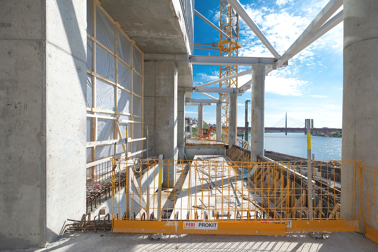 Kružni kosi stubovi daju posebnu prepoznatljivost objektu. Oni su izvedeni u kružnoj i zakrivljenoj oplati Doka Top 50, Framax sistem, koja se sastoji iz dva polukružna dela. Za kose stubove korišćen je Doka Framax sistem. Specifična je marka betona od MB70, korišćena za najvažnije elemente konstrukcije, i kvalitet smeše jedinstven za ovo podneblje.