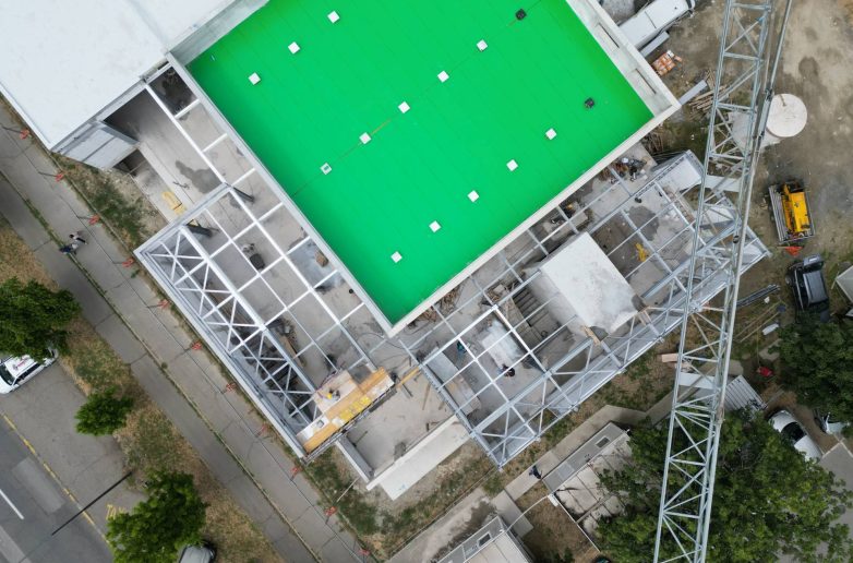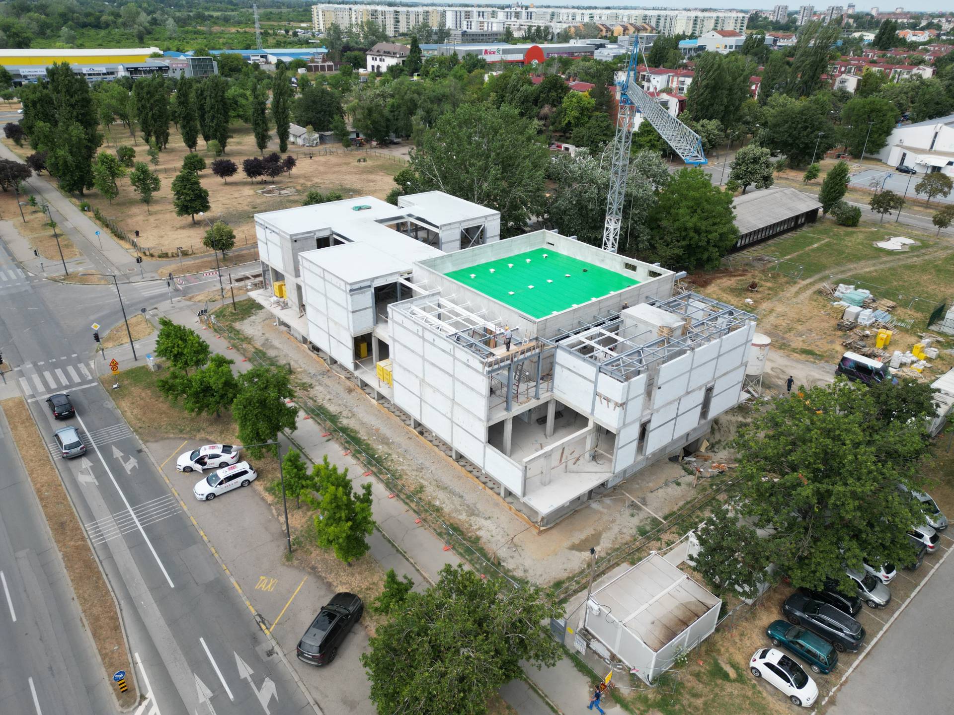 Na dron snimku vidi se i atika sa zelenom bojom na podu, u kojoj će se smeštati mašinska oprema, dok su prema projektu u podrumskoj etaži smeštene tehničke prostorije i garaža.