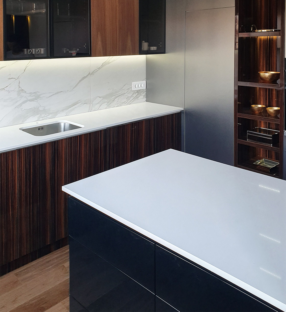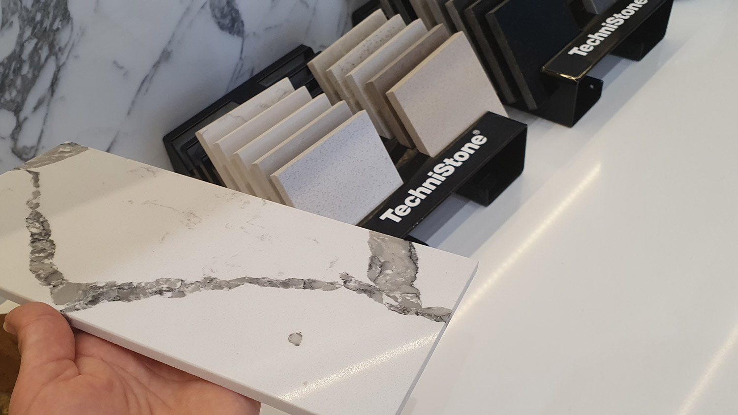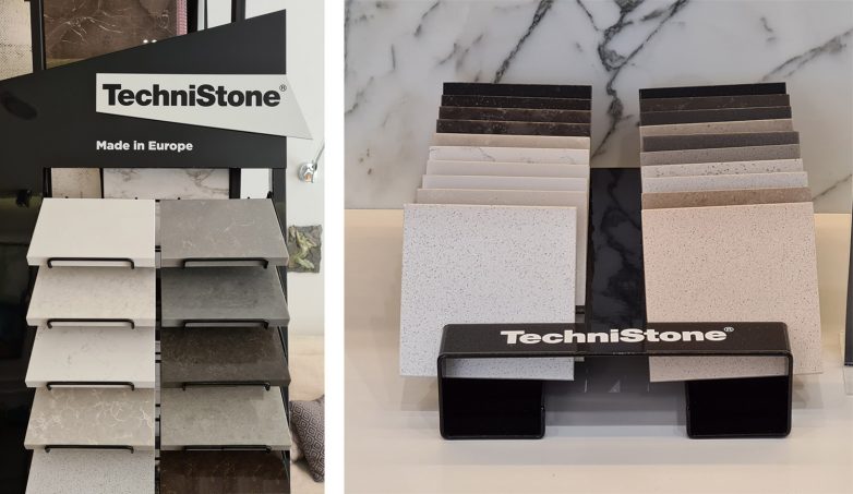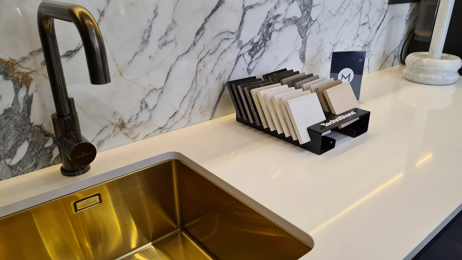 Vrlo lepe teksture pronašli smo u salonu Mermeta – Design & Furniture na Novom Beogradu koji zastupa brend TechniStone. Raskošna paleta vrlo primenjivih boja omogućiće da svako pronađe kolorit koji mu odgovara, međutim pažnju privlači trenutno vrlo aktuelna tekstura sa izgledom mermera, odnosno sa velikim naglašenim žilama koji imitira mermer Calacatta za koju je potrebno izdvojiti više novca od standardnih, jednobojnih nijansi.