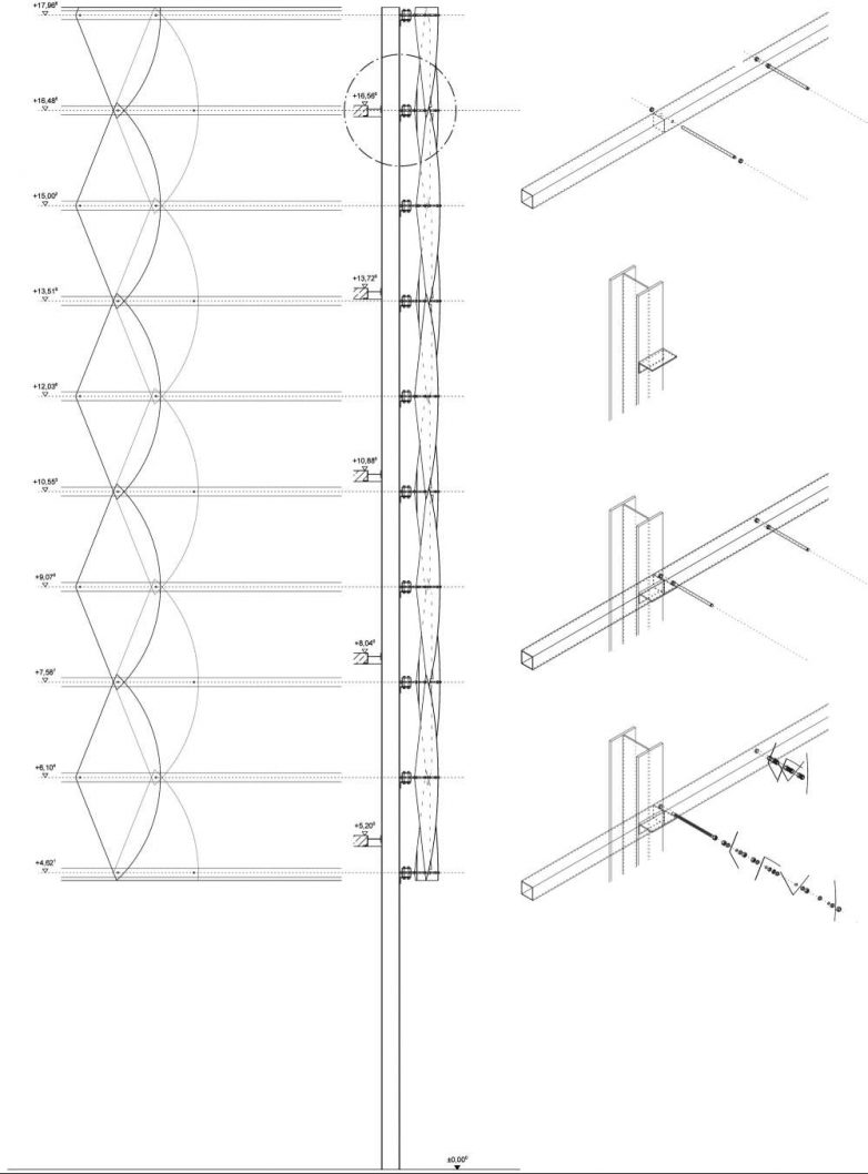Laserski sečeni paneli od perforiranog metala su montirani ručno na čeličnu potkonstrukciju, međutim zahvaljujući tome što je svaki element isti, sem onih na rubu fasade, montaža je tekla relativno brzo i jednostavno.