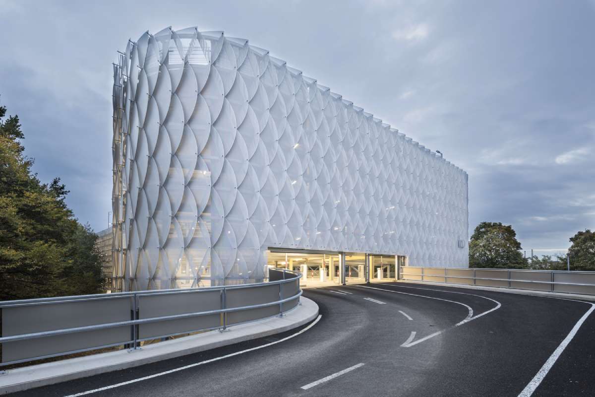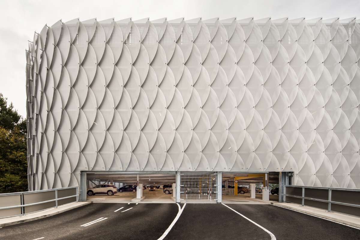 A u cilju pravljenja inovativne i upečatljive fasade, holandska kompanija Sorba izradila je oko 3.000 laserski sečenih panela od eloksiranog aluminijuma, koji imaju ivična ojačanja. Zahvaljujući tome što su paneli peforirani ali i sistem uklapanja panela, koji podseća na škrge, omogućen je prirodan tok vazduha i prirodnog osvetljenja, što rezultuje prijatnim ambijentom u unutrašnjosti garaže, piše ArchDaily.