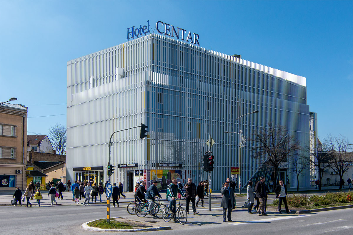 Zavrsna fasada hotela Centar nije izvedena prema projektu Brane Mitrovic, vec prema zelji investitora, zbog velikih finans. troskova, investitor nije mogao da zavrsi fasadu koja je bila predvidjena prema projektu. Ako se dobro secam investitor je bila mesara Matijevic 🙂