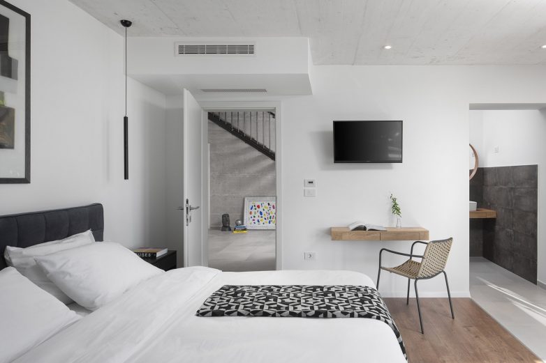 Zidovi i plafoni su fino gletovani i farbani belom bojom. Betonski zid uz stepenište nije gletovan već je ostavljeno da se vidi priroda materijala.