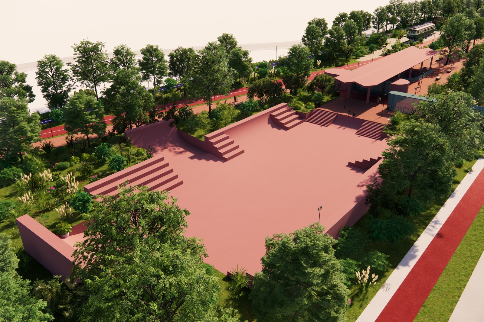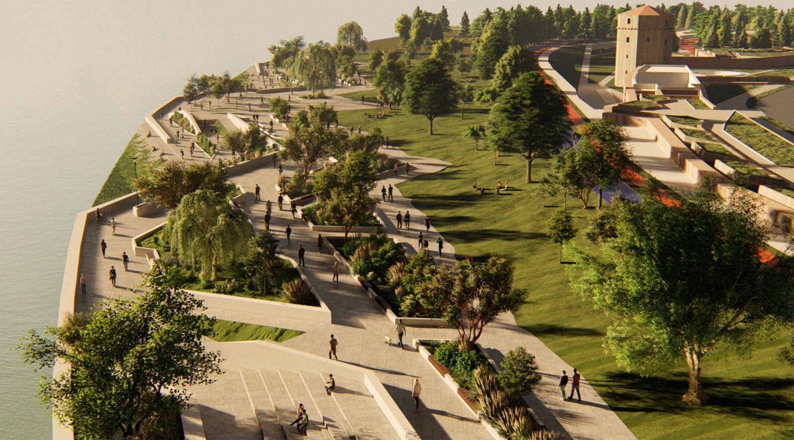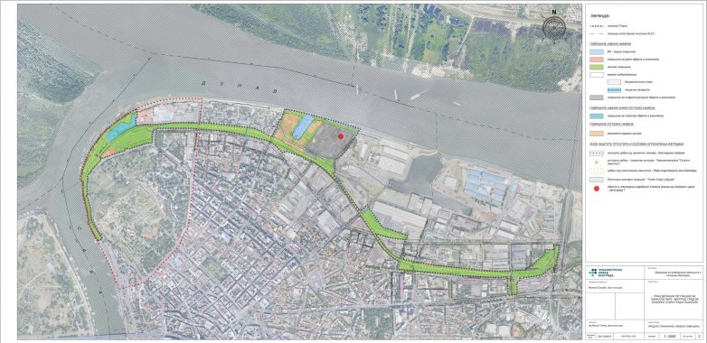 Autori Luka Ilić, Đorđe Bulajić i Kosta Dimitrijević imali su pred sobom površinu od približno 100.000m2 koja je nekada obuhvatala prostor srednjevekovnog pristaništa. Pokrenutost terena od bedema ka rekama rešena je preplitanjem snažnih horizontala u prostoru koje su namenjene pešačkom saobraćaju. Formirani tokovi na lokaciji su prostorno čitljivi i jasni, a dodatno su oplemenjeni zelenim površina koje su projektovane kao žardinjere. Bedem su autori prepoznali kao potencijal lokacije i mogućnost za direktan kontakt korisnika prostora sa vodenom površinom, pa su u skladu sa tim, oformili sadržaje poput amfiteatra i letnje pozornice koje su namenili kulturi. Pešačke staze su rešene kroz denivelisane strukture koje se protežu duž cele lokacije. Posebnu životnost prostoru daje kompleks oko sportskih terena koji je oblikovno rešen naglašenim dijagonalama u parteru.