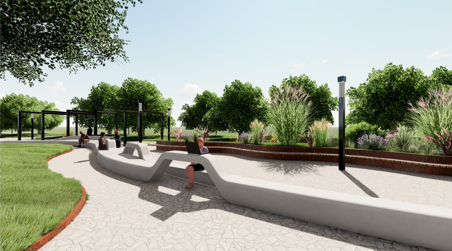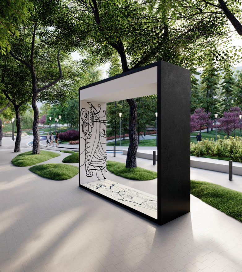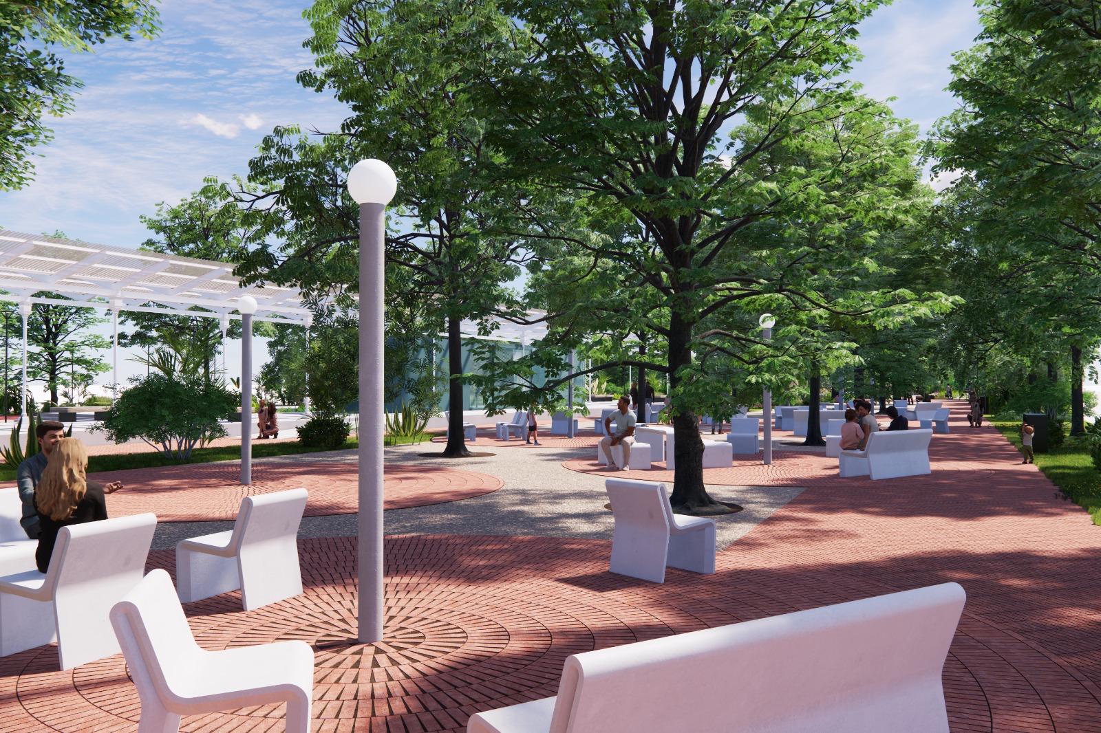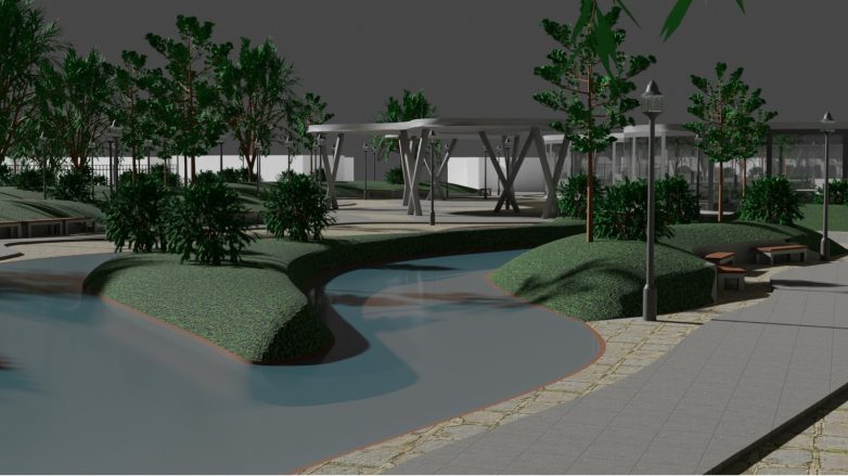 Koncept rešenja baziran je na uspostavljanju čitljivosti prostora formiranjem jasnih i nedvosmislenih pešačkih i biciklističkih tokova na lokaciji. U skladu sa navedenim, autori su projektovali amorfnu strukturu duž cele lokacije koja predstavlja svojevrsni urbani mobilijar – tačnije dvostrano orijentisanu klupu. Oblikovno, ova betonska struktura doprinosi prepoznatljivosti i atraktivnosti samog rešenja. Forma klupe je u funkciji sadržaja koji je prate, tako da pored svoje klasične upotrebe, omogućava korisnicima i niz dodatnih aktivnosti koji pretežno podrazumevaju rekreaciju i relaksaciju na otvorenom prostoru. Denivelacijom pomenute betonske strukture omogućena je protočnost na samoj lokaciji, tj. spajanje vrta i glavnog šetališta kroz portale koji se izdižu iznad zemlje, dok horizontalna projekcija klupe vizuelno odvaja ove dve površine. Kao drugi istaknuti element prilikom projektovanja ovog prostora nameće se jezero nepravilnog oblika koje doseže maksimalnu dužinu od 38m i širinu od oko 19m.
