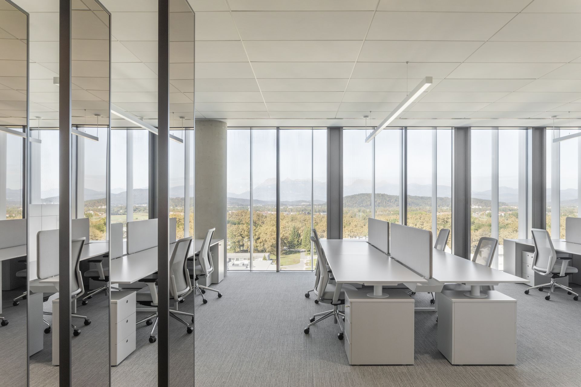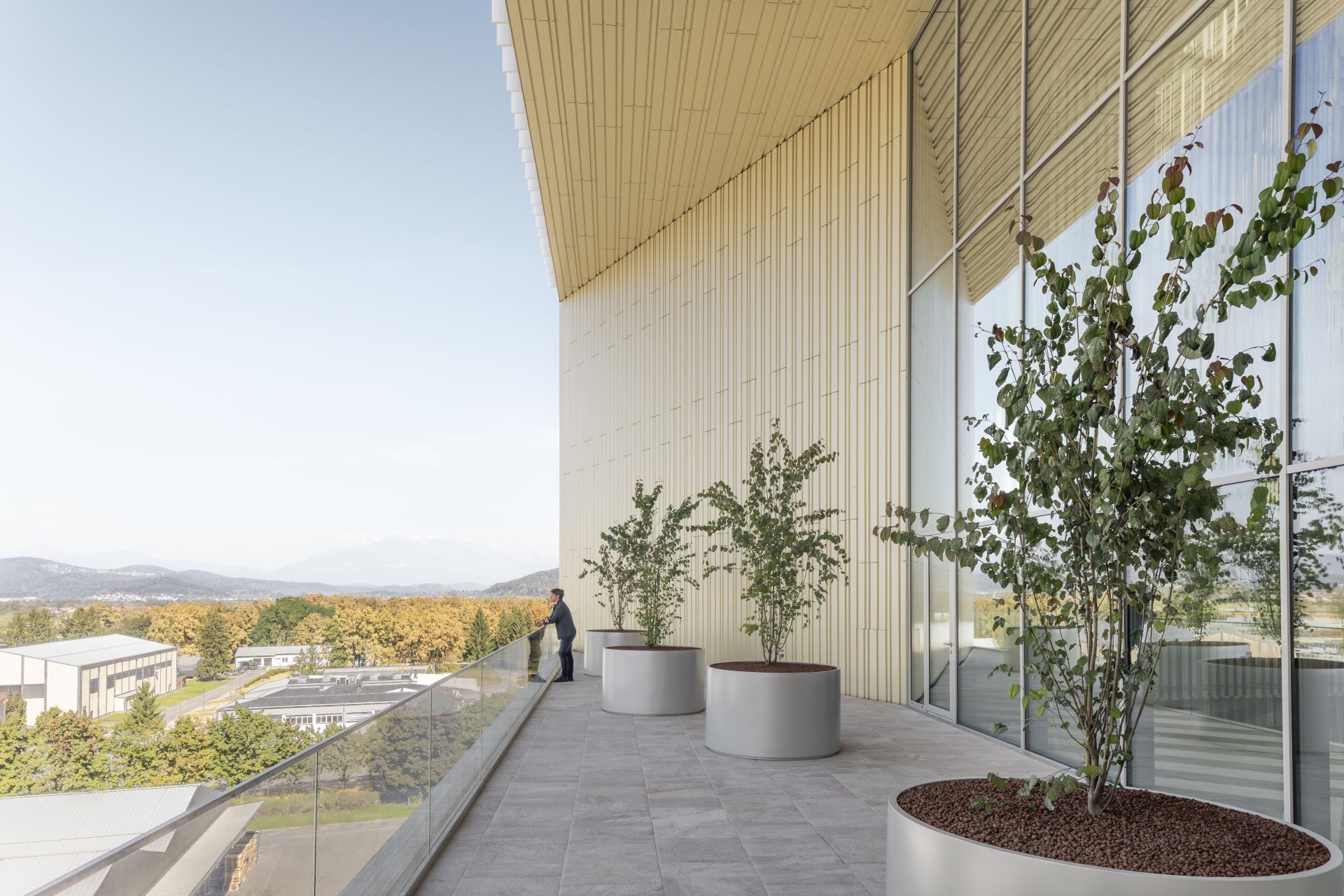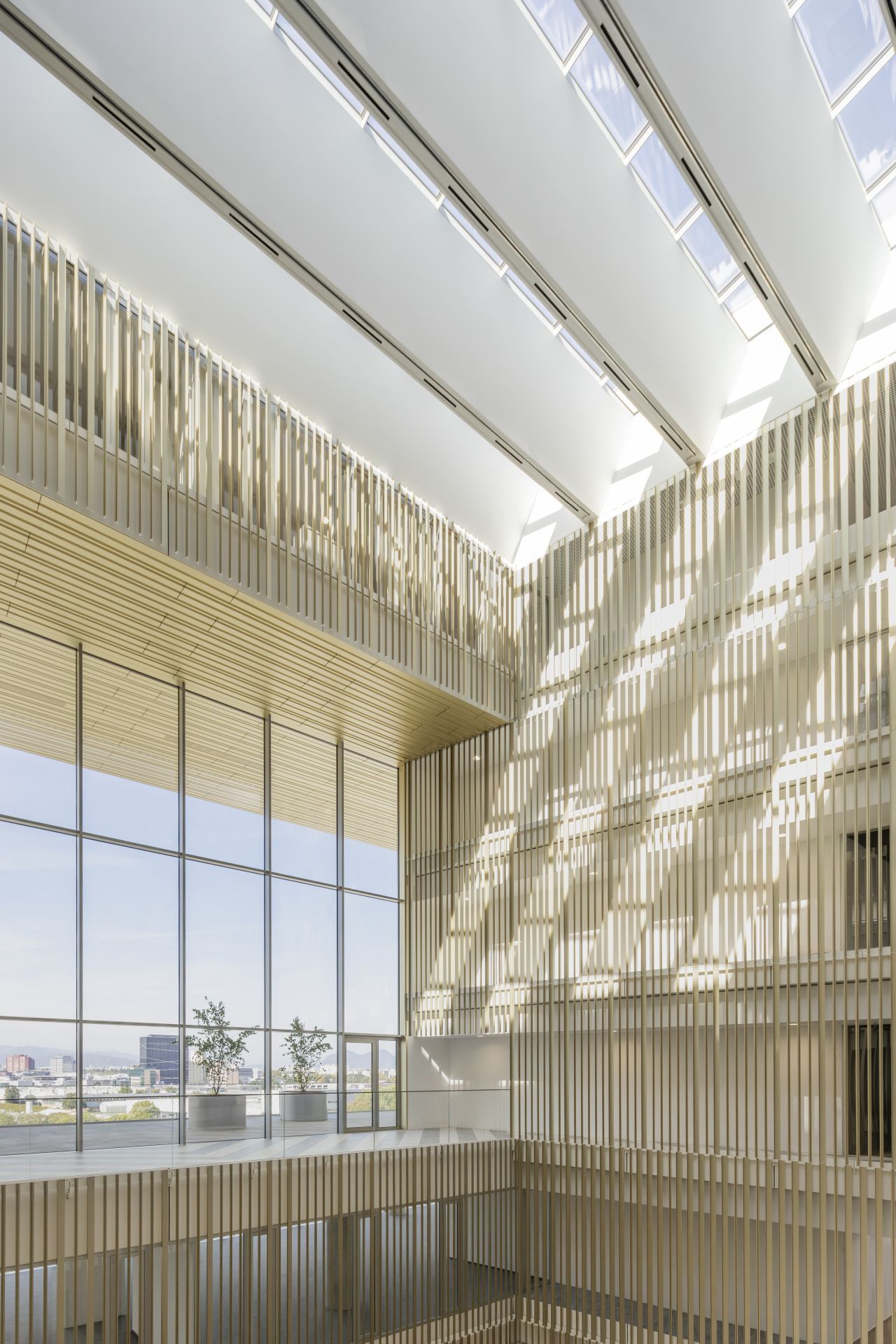 „Atrijum se otvara prema spolja kroz dva velika prozora visoka tri etaže, dodajući skulpturalni karakter prostoru, omogućavajući mu da bude okupan prirodnom svetlošću sa dve strane, kao i dozvoljavajući poglede na obrise grada i planinsku alpsku scenu sa njegovih terasa“ – objasnile su arhitekte.