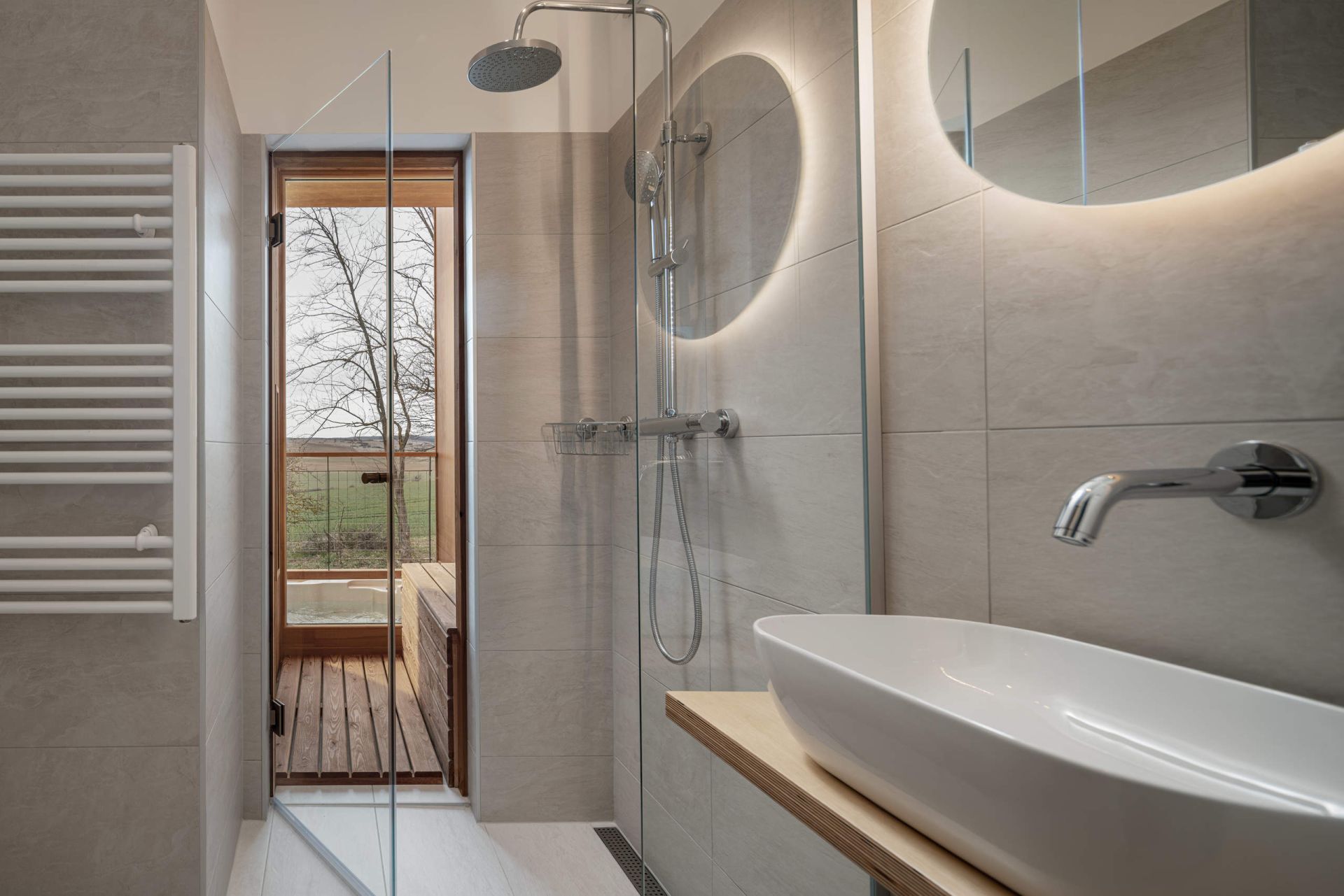 Da bi se stvorilo i pravo spa iskustvo, velika hidromasažna kada je ugrađena u prostranu, natkrivenu terasu, odvojenu samo staklenim prozorom od saune sa direktnim pristupom tušu.