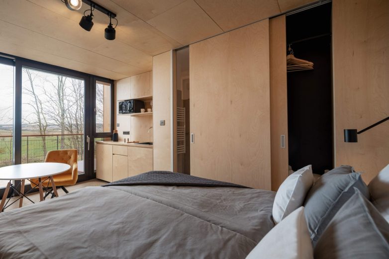 Svaka gleda na okolna polja i valovita brda, a posetioci mogu uživati u panoramskom pogledu sa terase, hidromasažne kade, saune sa staklenim zidovima ili čak iz kreveta.