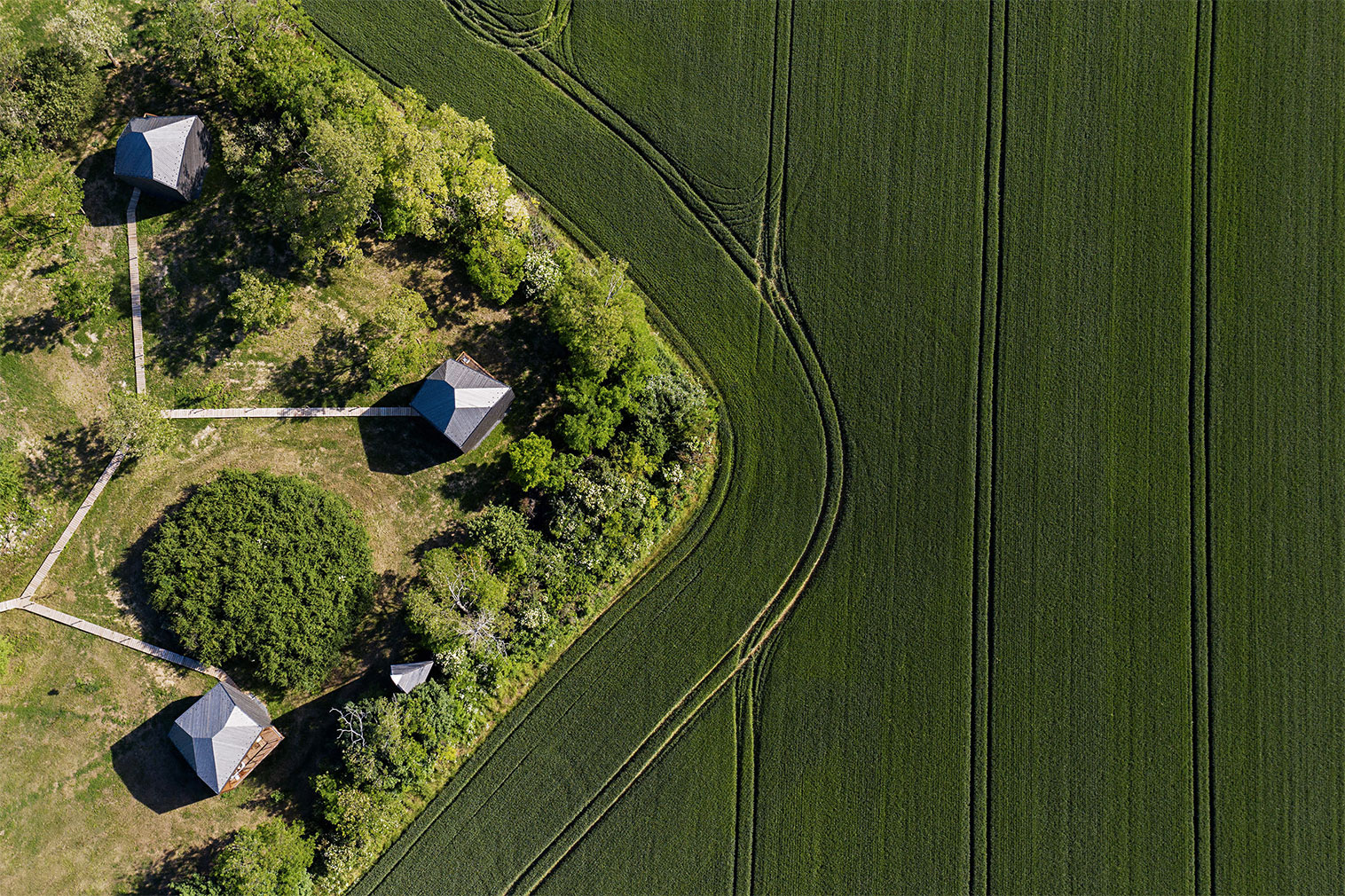 Svojim čistim oblikom nalik bloku, kabine organski prate okruženje, istovremeno održavajući kompleksna arhitektonska rešenja. Drvena obloga prirodno stari, stapajući se u zelenu pozadinu.