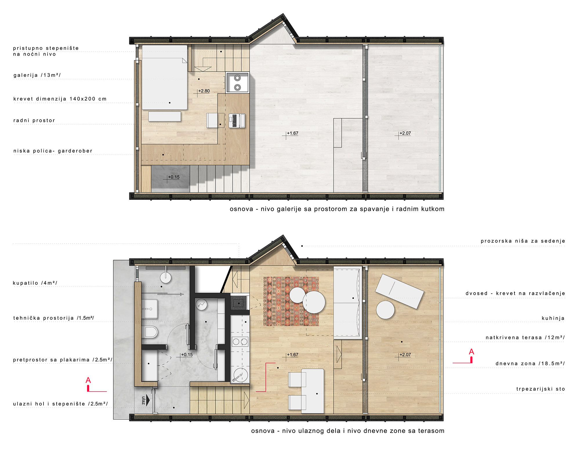 S obzirom da je tema konkursa bila prikazati nova oblikovna i tipološka rešenja malih objekata za boravak u prirodi, u tekstualnom obrazloženju koji prati crteže fokus je na tim aspektima kuće. Pitanja koja ste izneli u vezi uštede energije i tehničkih rešenja su jako važna, ali je teško osmisliti ih i prikazati u idejnoj fazi projekta, pogotovo na ograničenom broju grafičkih i tekstualnih priloga koji se očekivao od učesnika. Kuća bi se tokom razrade u fazi glavnog projekta naravno mogla opremiti solarnim panelima za el.energiju ili za zagrevanje vode, a tu je i mogućnost ugradnje toplotne pumpe i sl ,što sve zavisi i od planiranog budžeta potencijalnog klijenta. Kad je reč o klima uređaju zbog veličine kuće , svakako bismo se potrudili da izbegnemo spoljnu jedinicu na fasadi, već bi ona stajala nezavisno od objekta. Što se tiče ventilacije, možda niste obratili dovoljno pažnju, ali svaki ambijent ima fasadni otvor koji omogućuje prirodnu ventilaciju, tako da je kuća trostrano orijentisana uz mogućnost otvaranja i dodatnih krovnih prozora nad ambijentom za spavanje,. Nadamo se da smo ovim odgovorom otklonili neke vaše dileme,, i da nismo bili previše opširni 🙂 Srdačan pozdrav!