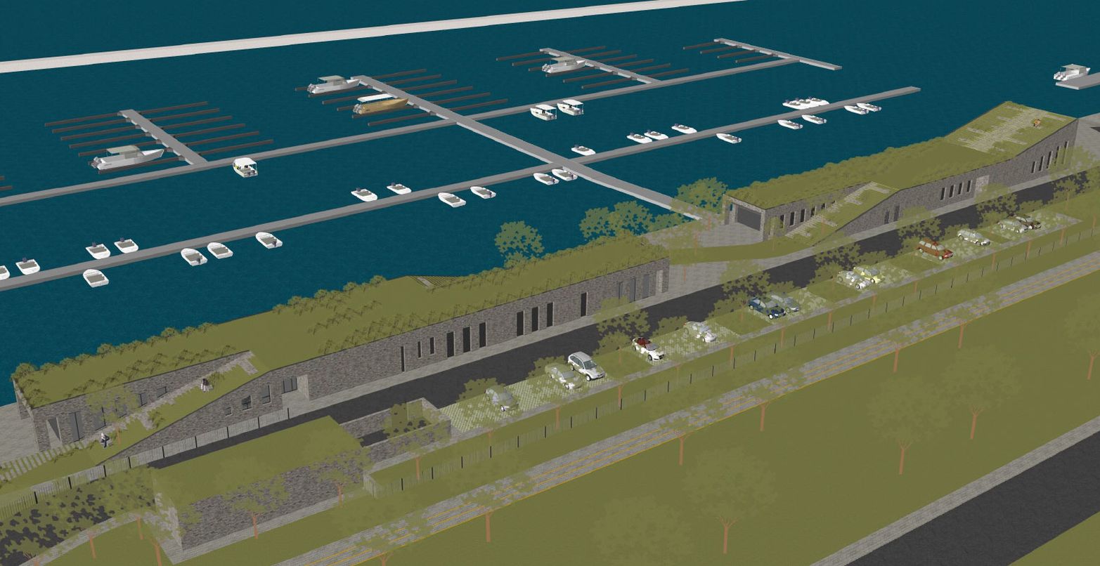 “U cilju sagledavanja tvrđave, suživota sa istom, otvaranja vizura i nenarušavanja vrednosti zatečenog pejzaža, nametnuli su se prizemni objekti koji izrastaju iz terena, dok je sama izdužena forma postojeće teritorije lučkog područja diktirala linearnu formu zgrada na teritoriji“.