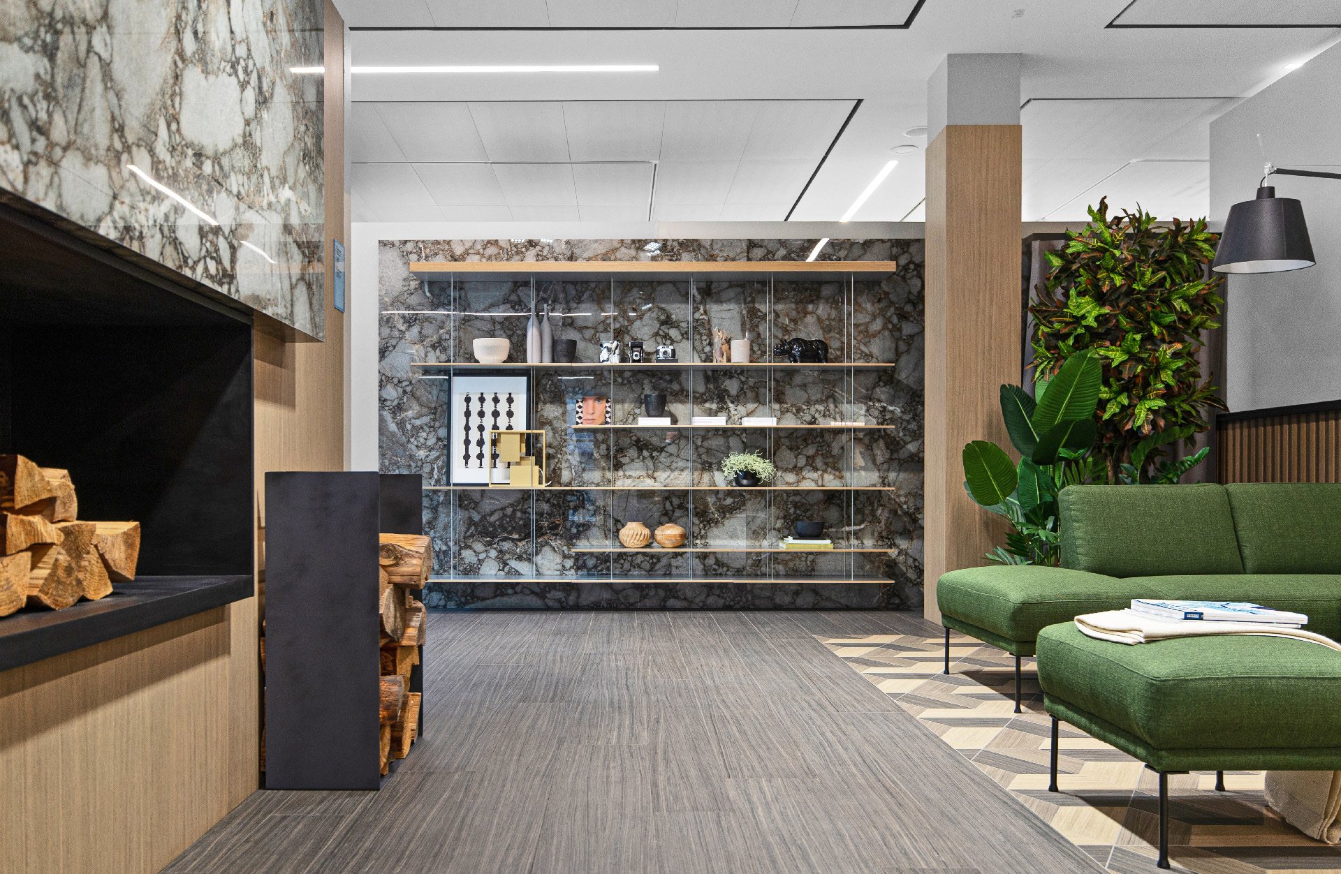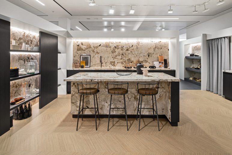 Florimova serija Nature mood je na prikazanoj kuhinji postavljena kao backspash, zidna obloga iza polica, obloga šanka ali i kao radna ploča. U pitanju je boja Tundra sa žilama u paleti od svetlo bež do crne. Zbog toga se lepo slaže sa tamnijim furnirima.