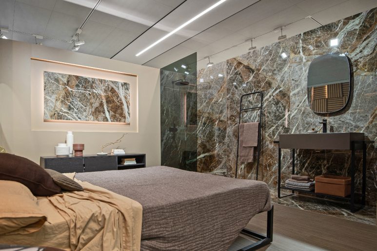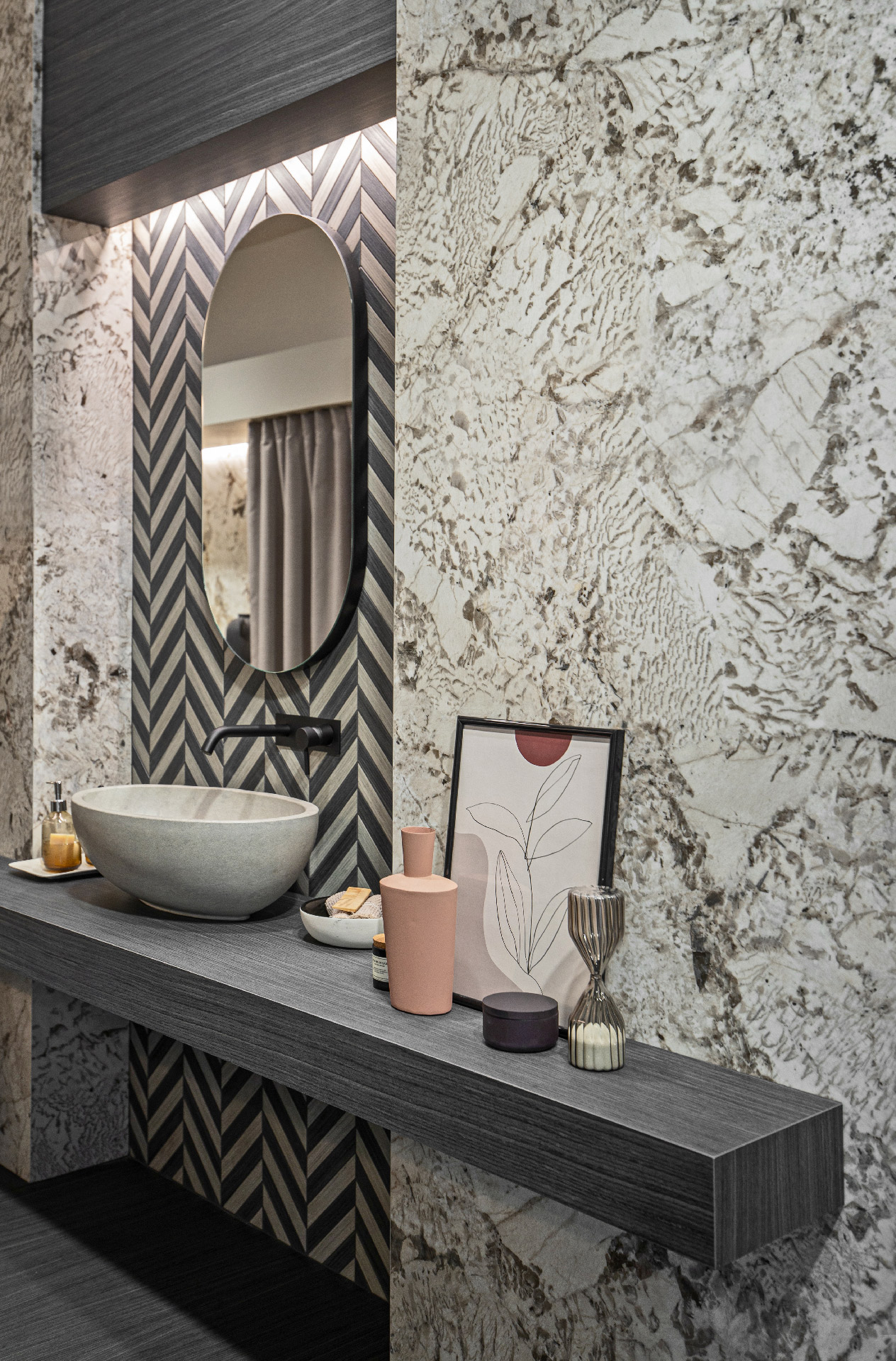 Ako je kupatilo vizuelno povezano sa spavaćom sobom, ono mora biti uređeno luksuzno. U ovom primeru korišćena je pločica Florim, Creative Design, serija Nature mood, boja Riverbad.