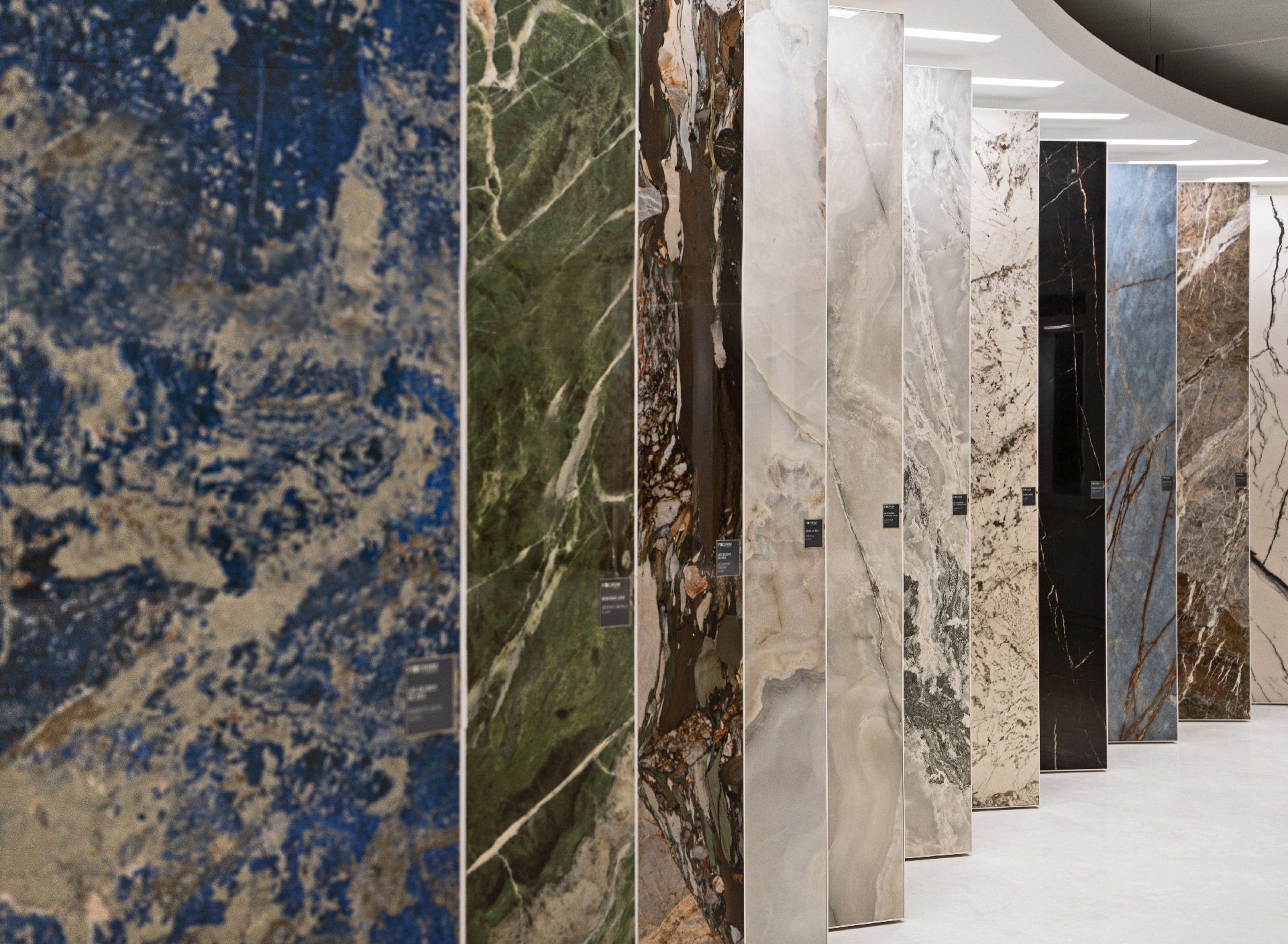 Na slici su prikazane boje (s desna na levo): Onyx, Blanche i Solid Blue u najvećem formatu 120 x 280 cm. Cena ovih mermera je oko 105–115 evra/m² zavisno od završne obrade, mat ili sjaj.