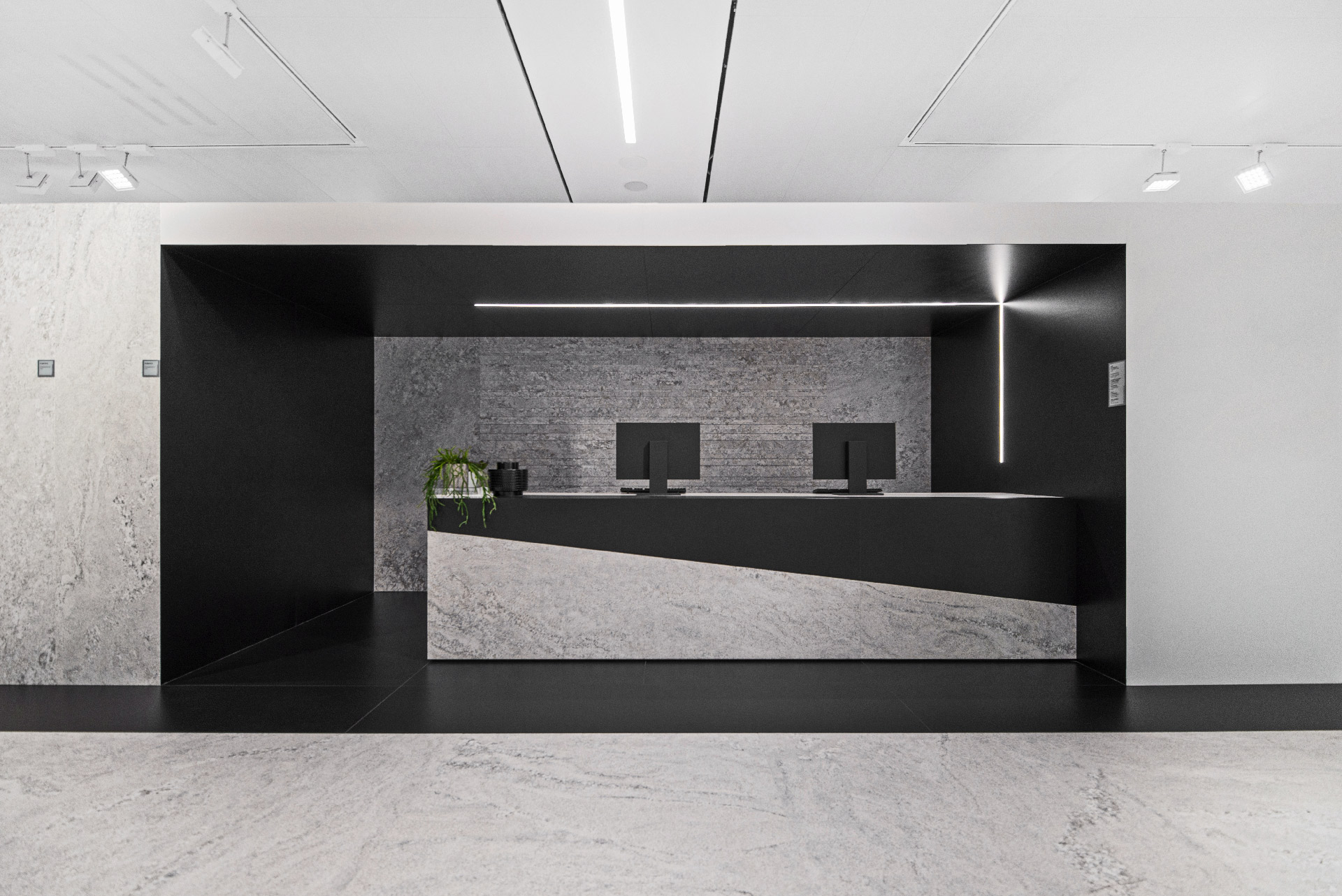 Pločica koja je izgleda nešto između kamena i mermera upotrebljena je prilikom dizajna ovog prijemnog pulta.