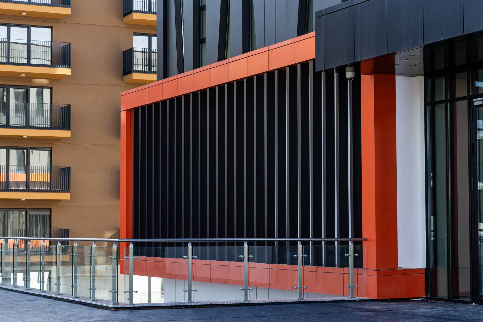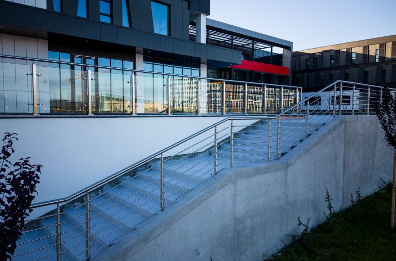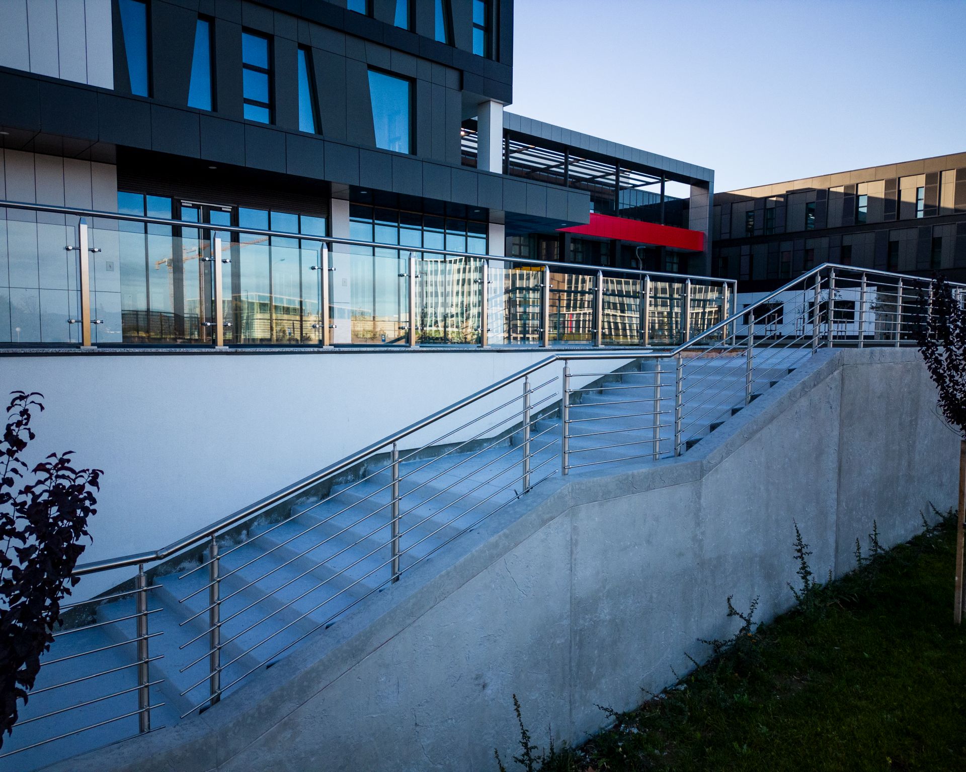 Još jedno njihovo rešenje koje bi trebalo istaći, jeste i ono primenjeno na Centru izvrsnosti u Kragujevcu – stubični sistemi ograda sa raznim vrstama ispuna, sa staklenim ispunama sa dodacima u vidu LED rasvete na određenim delovima.