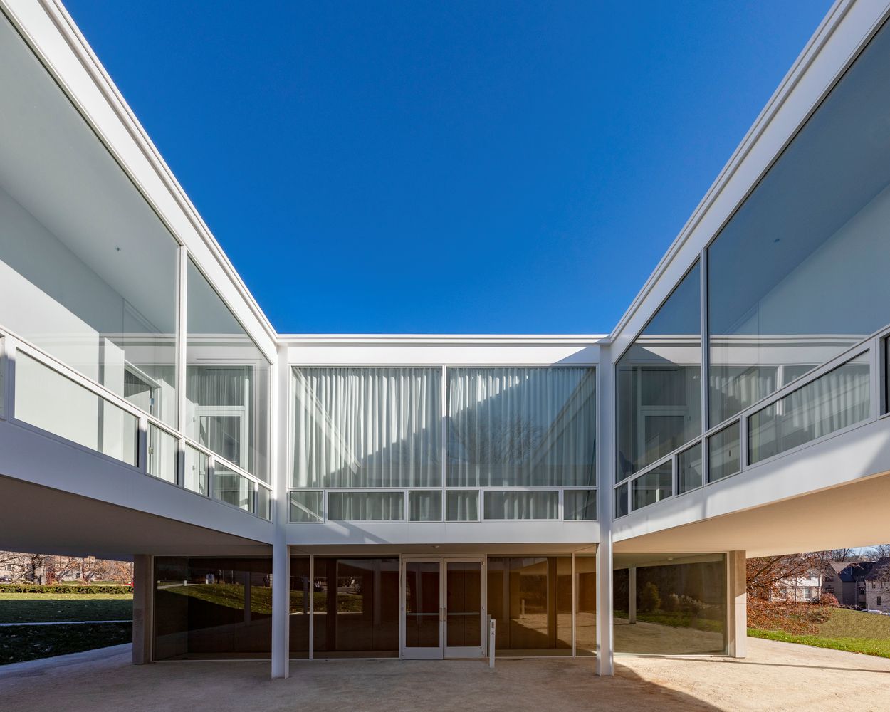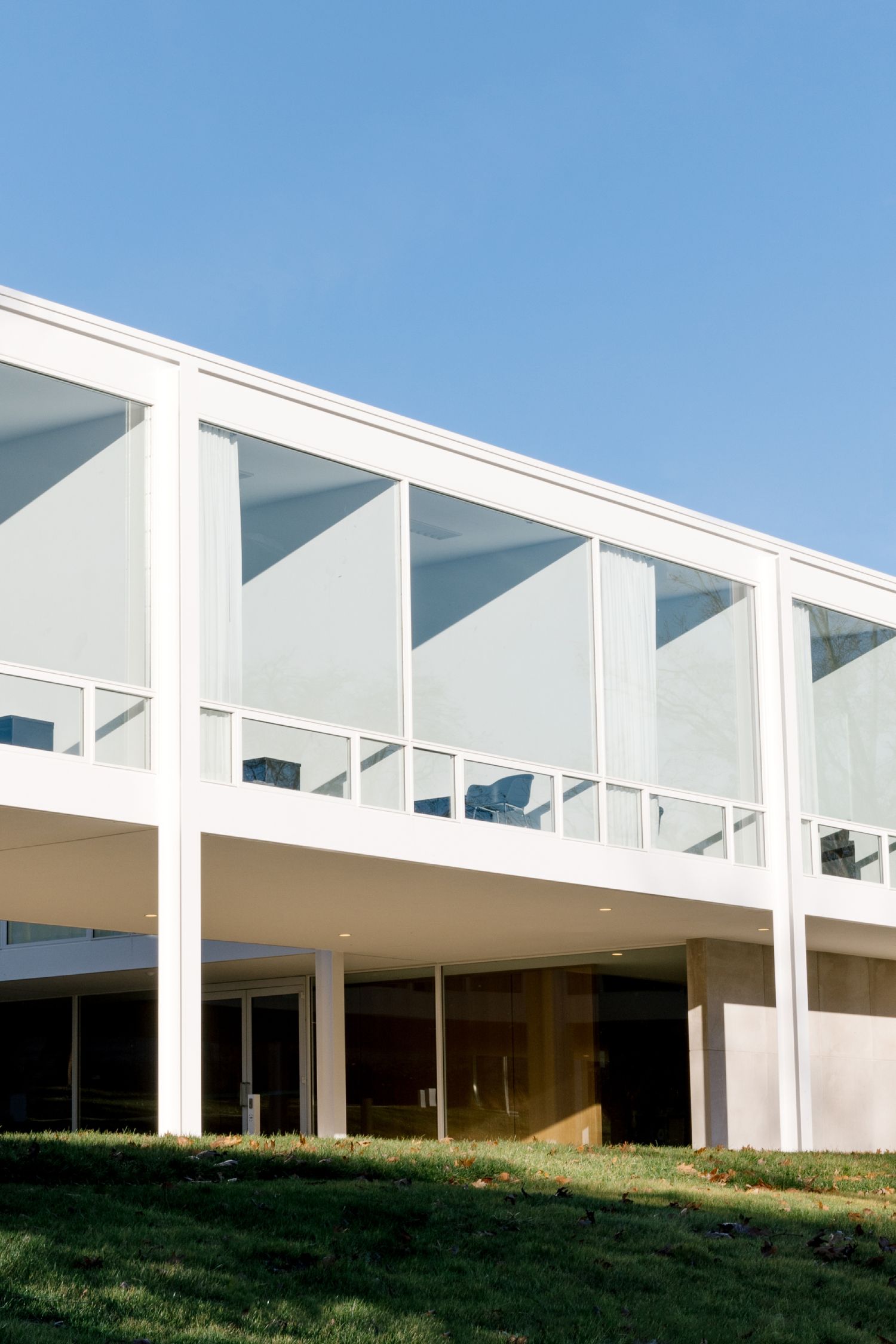 Dizajn, koji podseća na Van der Roeovu kuću Farnsworth i Tehnološki institut Ilinoisa u Čikagu, karakterističan je po belom čeličnom okviru i velikim prozorima od poda do plafona.