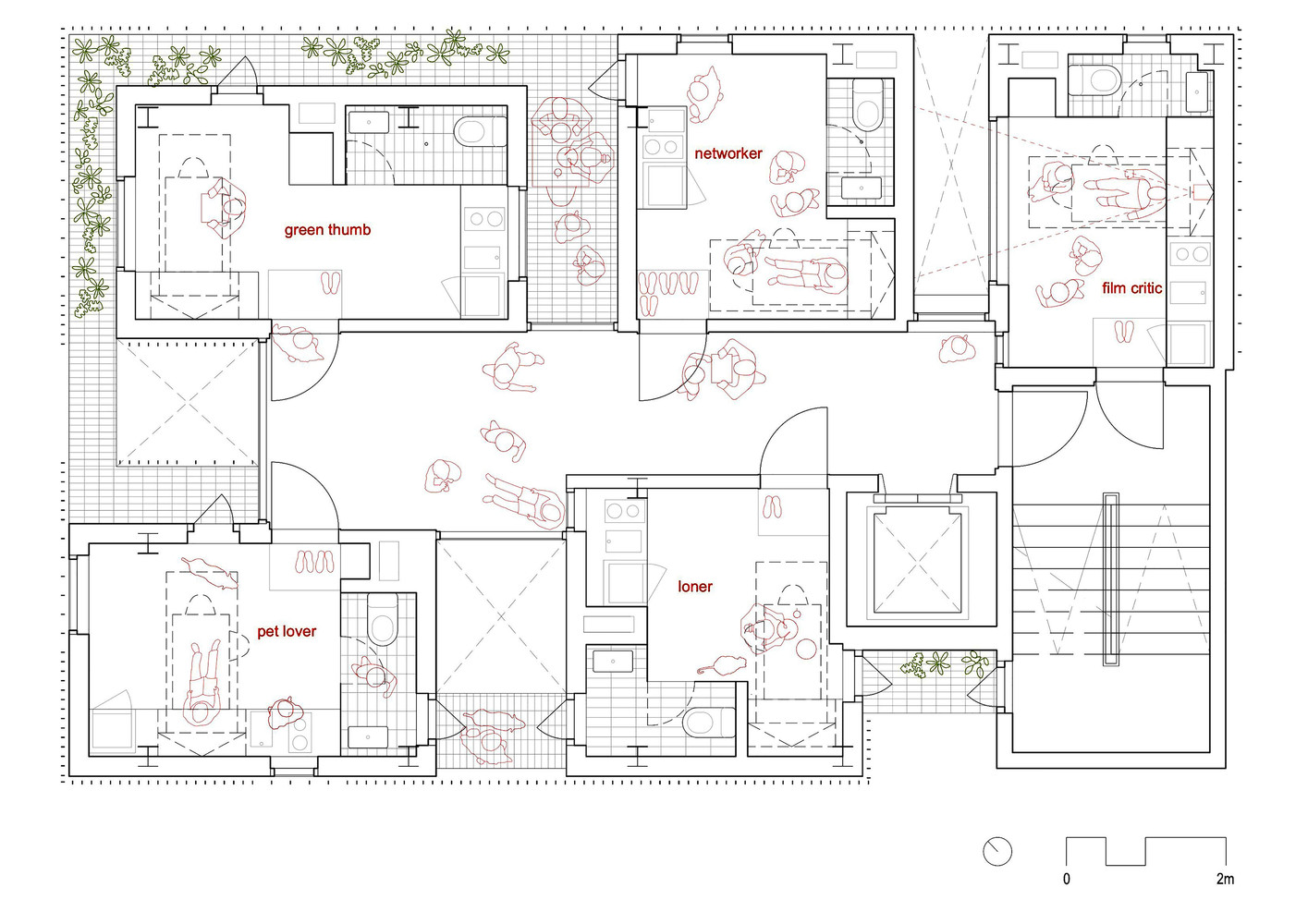 U stanu najviše spavamo, a najmanje stanujemo. Prateći ovaj trend savremenog životnog stila, a u cilju stvaranja dodatne vrednosti i pratećih sadržaja oko „kreveta“, SsD arhitekte osmislile su sasvim novu stambenu koncepciju. Nadovezujući se na tradiciju organske arhitekture i stvaralaštvo Kišo Kurokave, stambene mikro-jedinice dopunjene su različitim polujavnim, zajedničkim prostorima i mnogobrojnim terasama. Drugim rečima, pored same jedince-kreveta-stana, korisnicima su na raspolaganju još i kafić, mini-amfiteatar i dve krovne terase, te podrumske ostave.