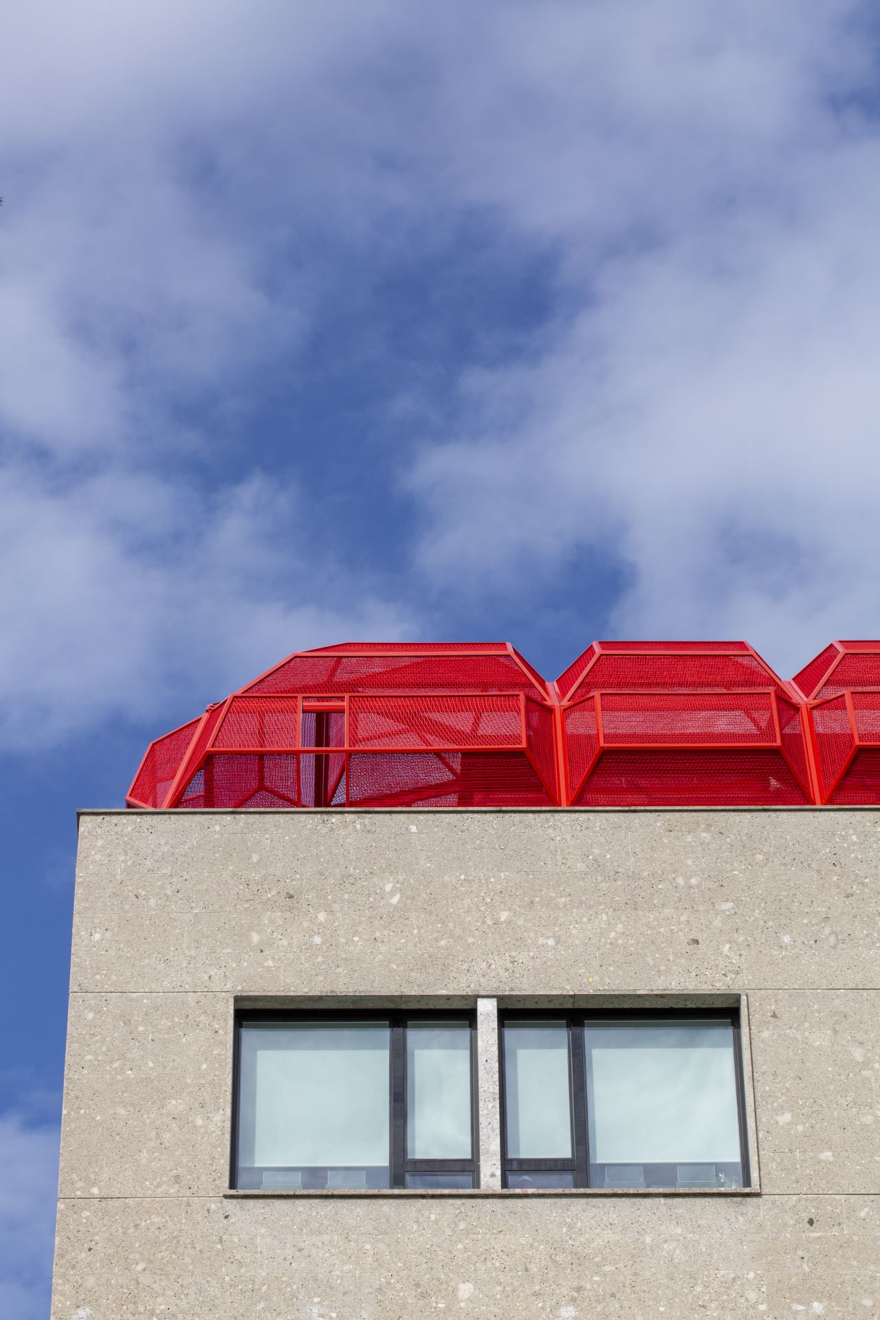 Kupolasta konstrukcija je odevena u tri sloja crvene mrežaste tkanine. Ritam isprepletenih niti daje oblik filigranskoj arhitekturi, sašiven i povezan tekstilnim tkanjem poput izloženih dragocenosti.