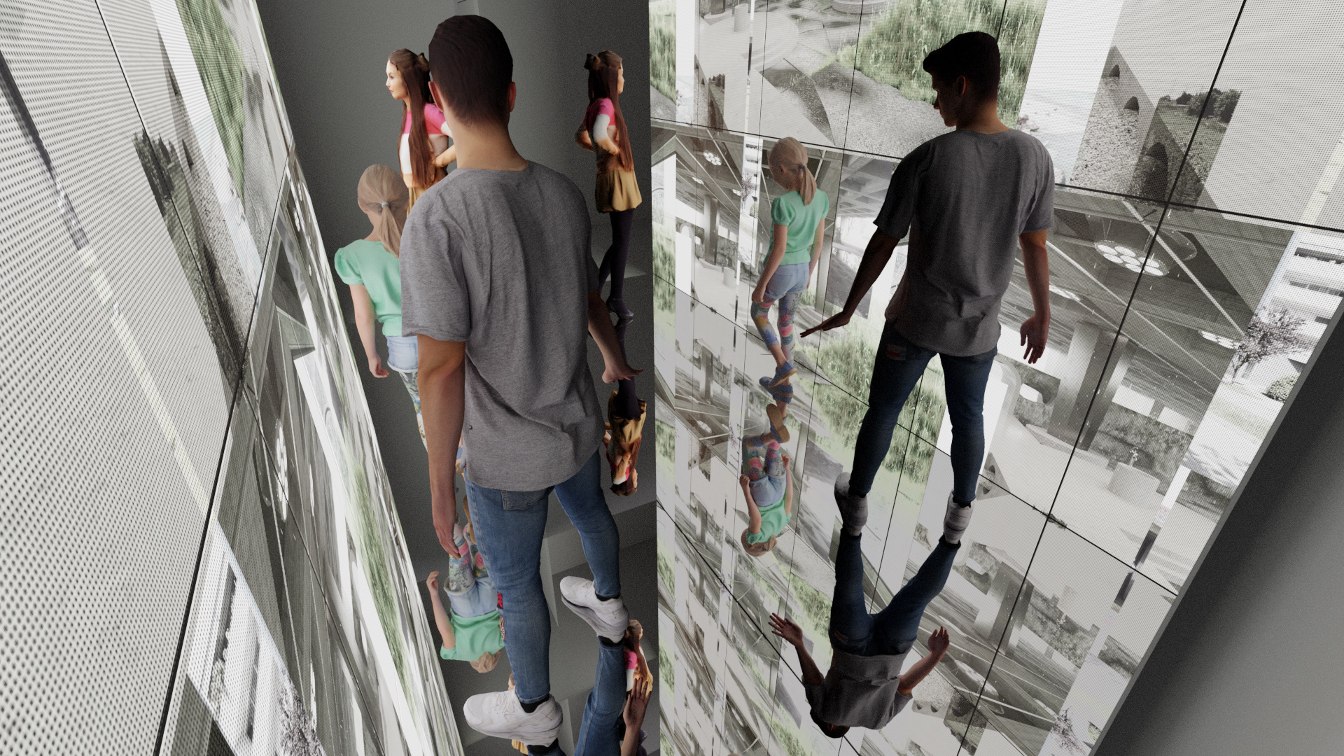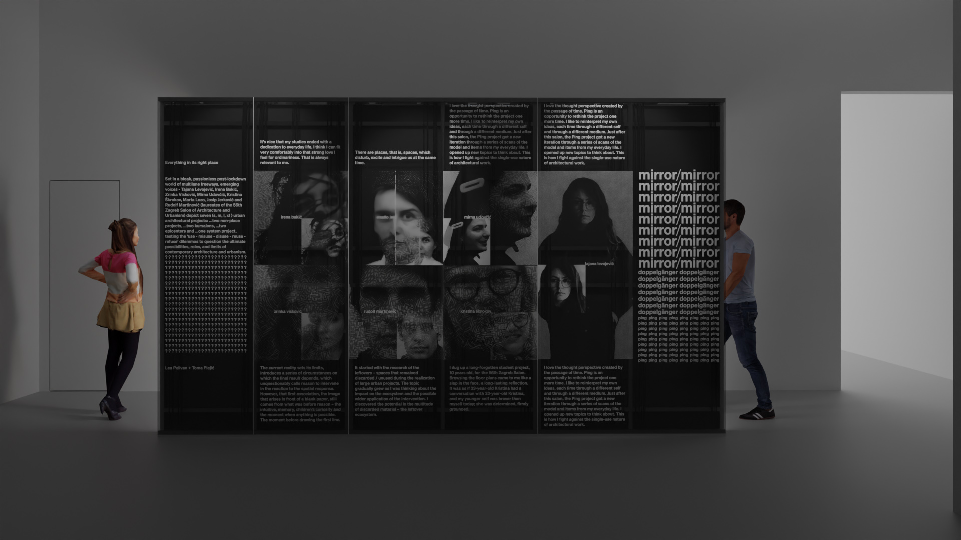 Arhitektonsku postavku instalacije „Mirror/Mirror“ u prostorima Palazzo dell’Arte potpisuju Antun Sevšek i Damir Gamulin, autorski radovi nadolazećih glasova reinterpretirani su u formu višeminutne repetitivne video-izložbe autora Ivana Slipčevića, a prate je zvučni efekti autora Jakše Kalajžića.