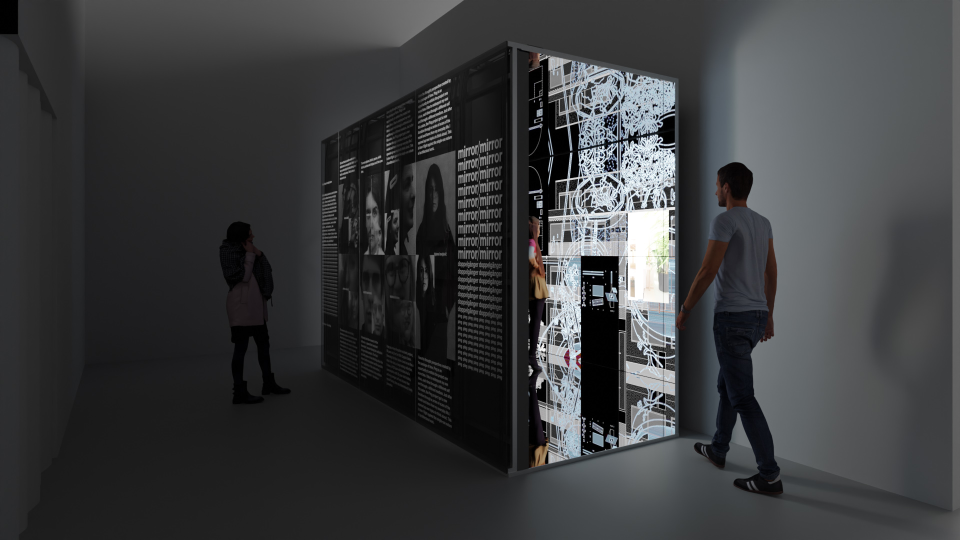 Organizovana kao konstrukt sazdan od obešenih multimedijskih ravnina i reflektujućih površina, instalacija je izgrađena kao matrica velikoformatnih LCD ekrana.