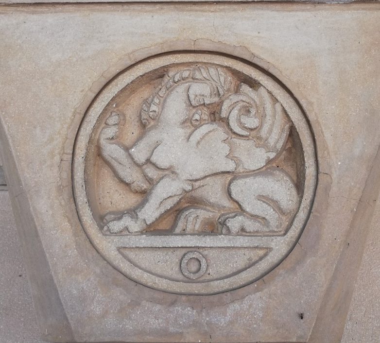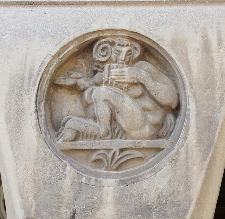 Najviše pažnje posmatrača privlače dve monumentalne statue sfinge, postavljene na bokovima prilaznog stepeništa, koje su delo vajara Zagorodnjuka. Nešto diskretnije obrađen je i glavni ulaz u hotel sa suprotne strane, koji takođe poseduje trem. Kapiteli stubova trema dekorisani su reljefima u betonu, na kojima su predstave mitskih bića, polu ljudskih-polu životinjskih, kao što su Satir, Kentaur, Sirena i Sfinga. Kako je zgrada hotela izgrađena u prirodi (poludivljem prostoru), ovim je naglašeno prisustvo čoveka u tom okruženju, jer sva ova mitska stvorenja simboliše borba njihove razumne čovečije prirode sa divljom, strastvenom prirodom životinja. Sfinga je posebno naglašena jer su u njoj ovaploćene karakteristike čoveka i tri svete životinje – bika, lava i orla i kao takva prestavlja čuvara mitskog, iracionalnog, sveta tajnog znanja, koji je dostupan samo odabranima.