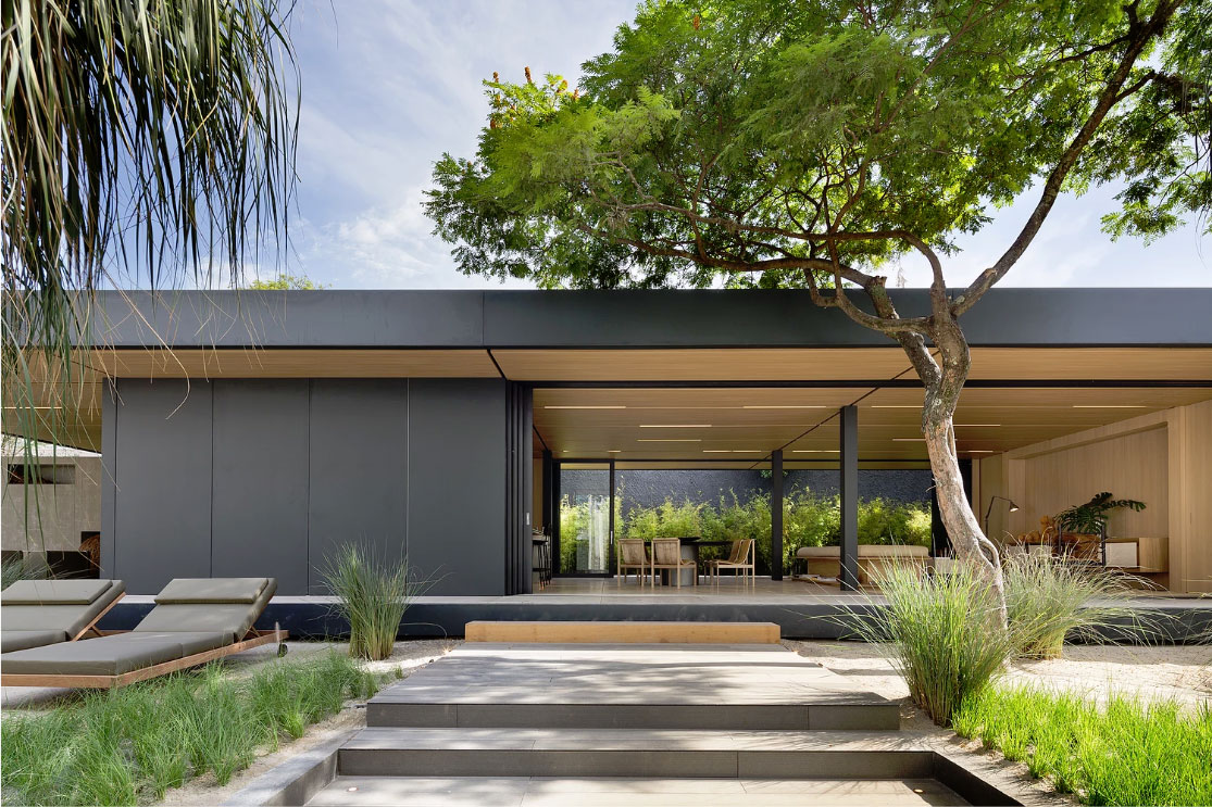 Kohezivni dizajn kuće površine 205 metara kvadratnih naglašava snažnu vezu sa okolnom prirodom zahvaljujući velikim kliznim vratima koje poništavaju vizuelnu granicu između otvorenog i zatvorenog prostora, ali i odabranoj paleti prirodnih materijala koji čine enterijer laganim.