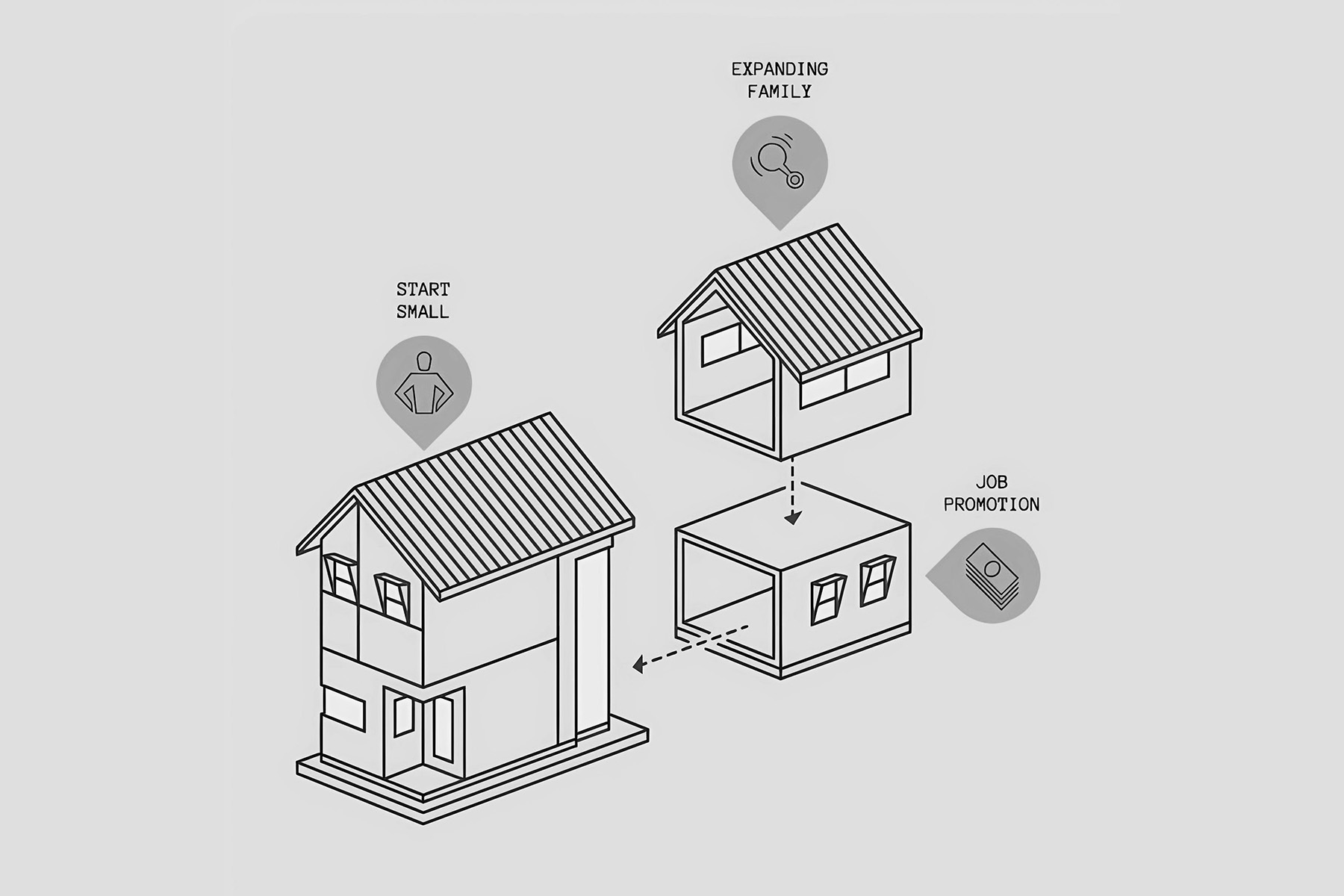Jedan od upečatljivih primera dolazi iz kompanije Nook, čiji jedan od koncepta predviđa modularnu kuću koja se gradi u tri faze. Počinje se sa osnovnim modulom od 45 kvadrata, namenjenim dvočlanoj porodici. Slede dogradnja garaže i radne sobe, a zatim i proširenje sa dodatne dve spavaće sobe za decu.