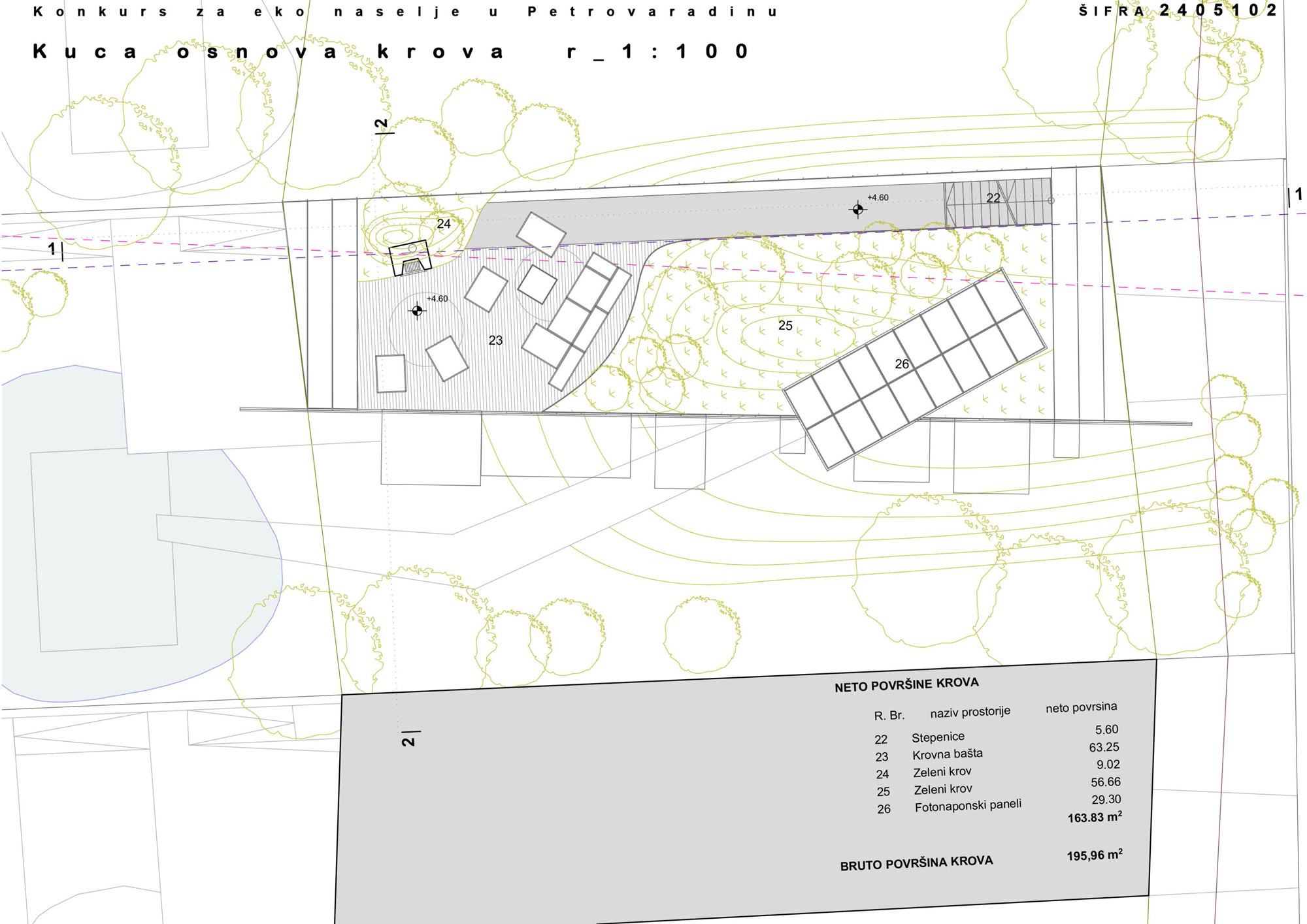 Krov predstavlja ekstenziju dvorišta, translatorno podignuti „deo“ dvorišta sa zelenom površinom i svim pripadajućim sadržajima.
