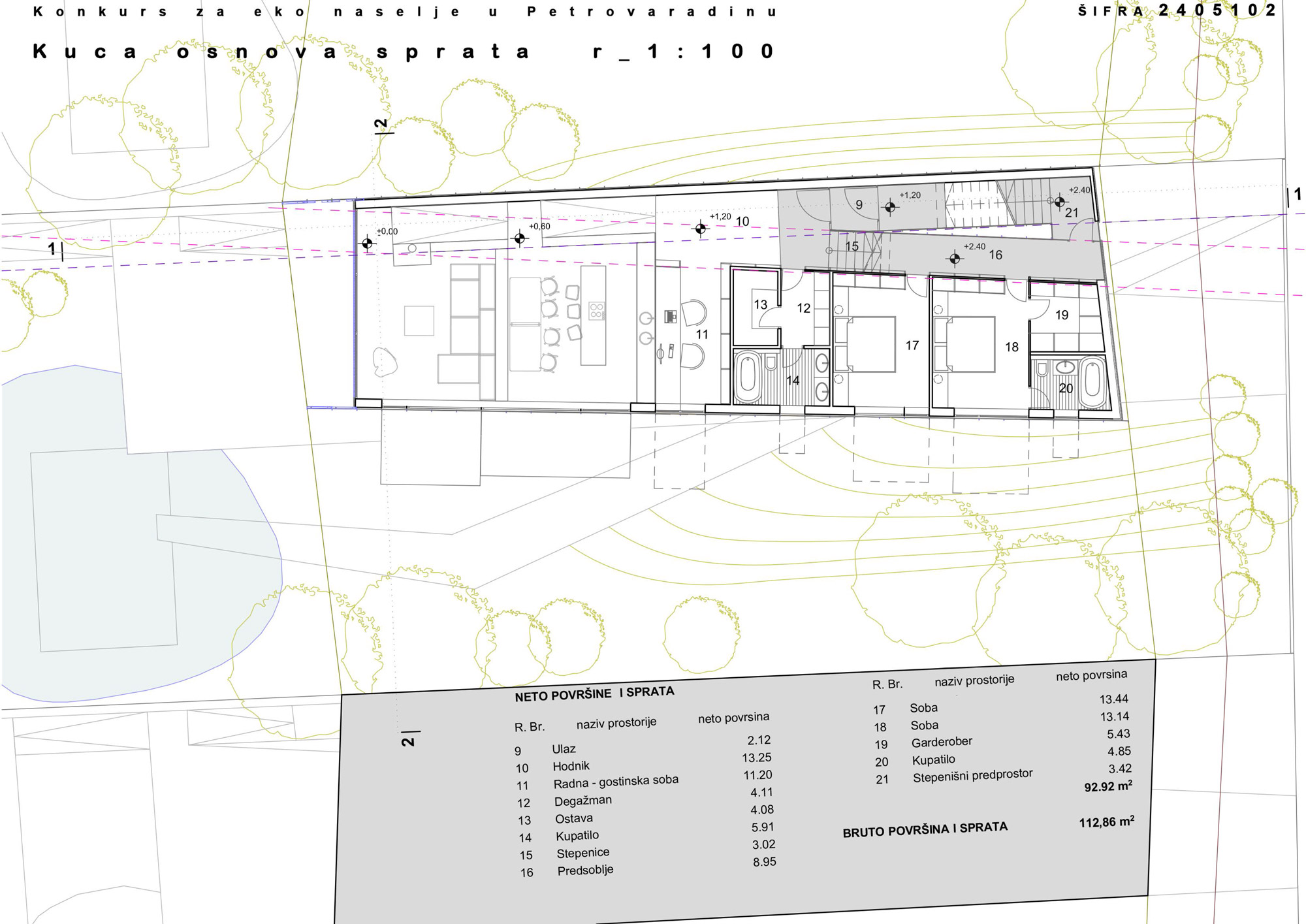 Osnovni „modul” je spratnosti P+1. Specifično je to da ulični deo objekta ima slobodno prizemlje natkriveno spratnim delom, gde je predviđeno parkiranje vozila, dok se u dnevnom boravku ostvaruje dupla visina.