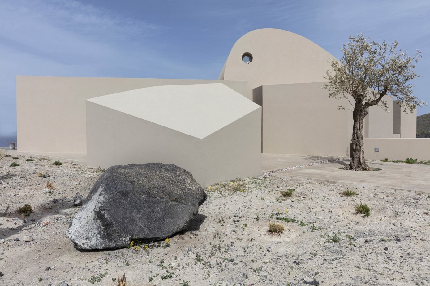 „Veštački masivni kamen izgleda kao da je tu od samog početka, kao deo vulkanske erupcije, oblikovan elementima prirode, mora i vetra. Prirodna erozija deluje na formacije čvrste mase, a postepeni proces uklanjanja kamena stvara zatvorene i otvorene životne prostore“, opisali su za Dezeen svoj projekat grčki arhitekti.