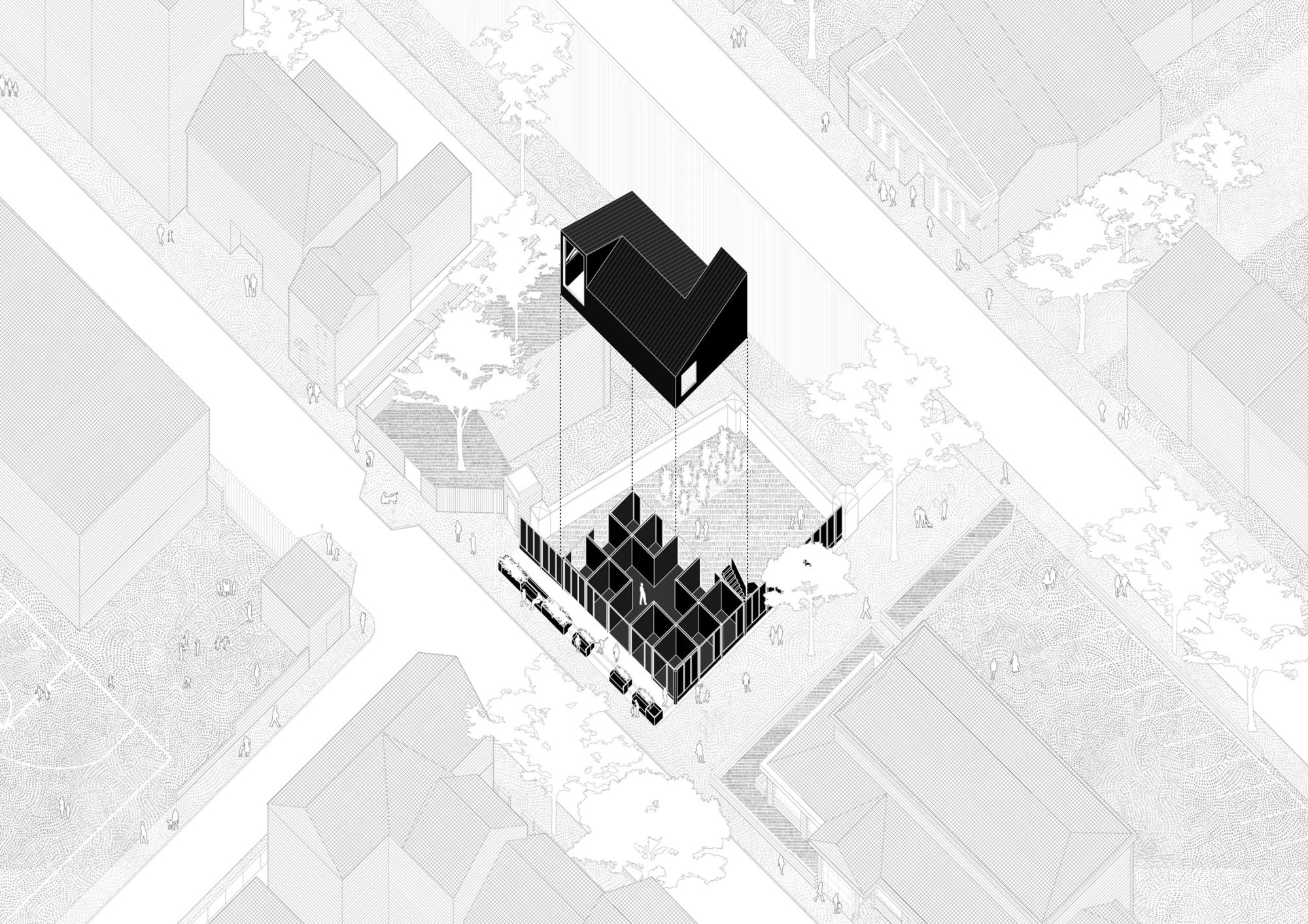 Jednostavan okvir od drveta i čelika nalazi se na postojećim temeljima iz prethodne upotrebe lokacije.