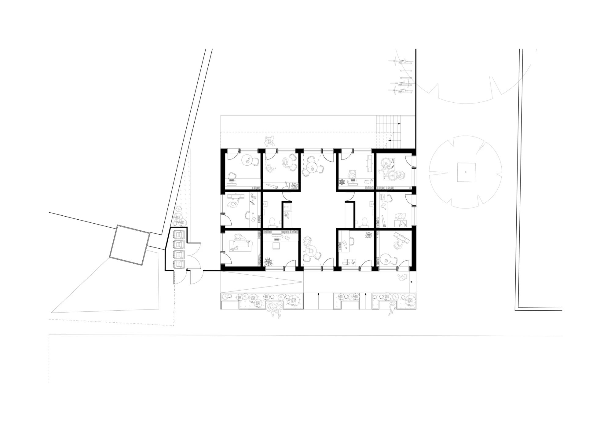 Svim jedinicama radnog prostora se pristupa spolja, sa pristupnim stepenicama i etažom na severnoj strani zgrade koja povezuje gornje prostore, kako bi se smanjila potreba za prostorom za cirkulaciju.