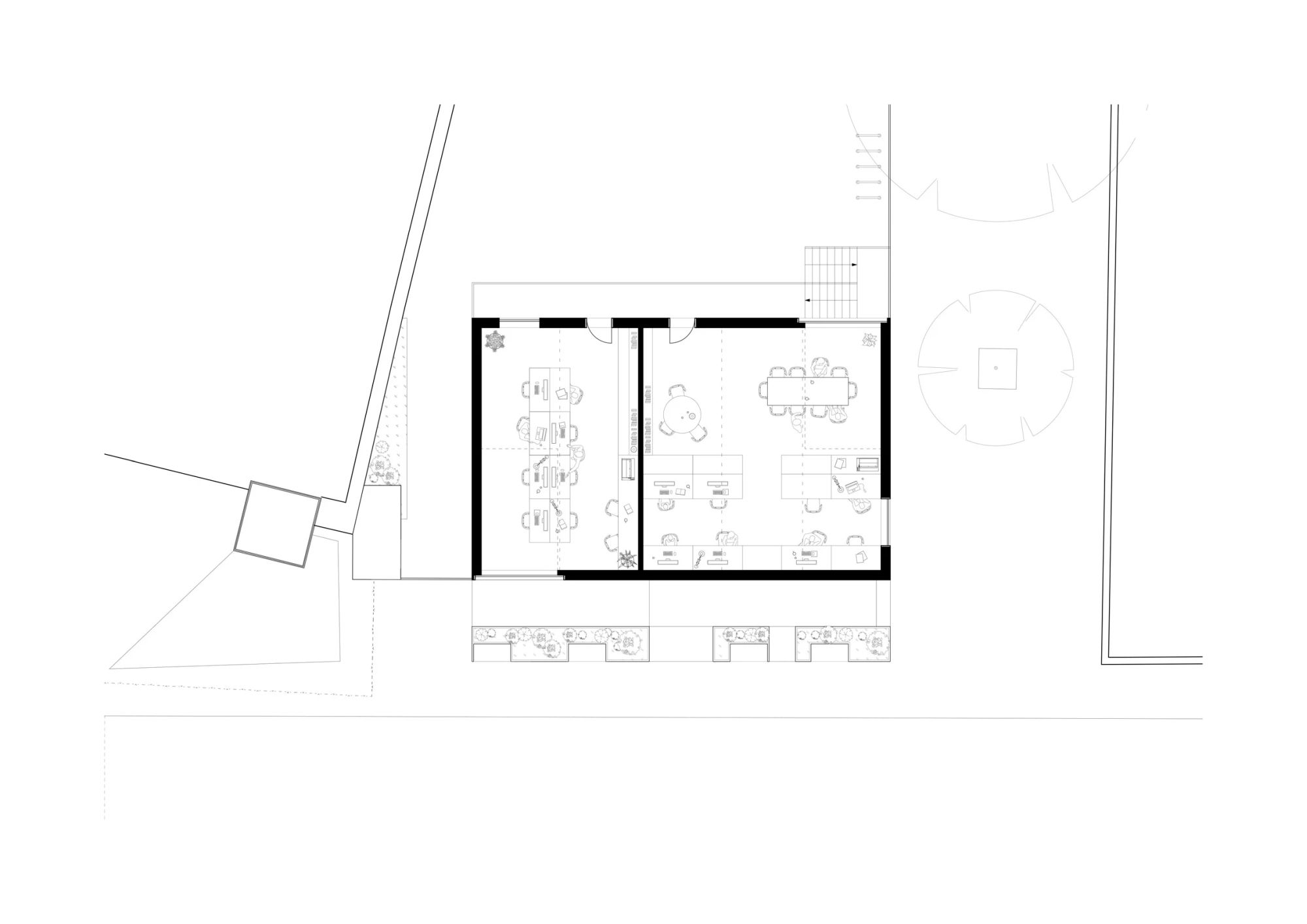 Sa 12 jedinica za radni prostor – od kojih jednu zauzima Meanwhile Space, firma koja se bavi upravo prenamenom napuštenih placeva – kao i centralni prostor za okupljanje, kuhinju i dvorište severno od lokacije, zgrada je dizajnirana tako da se izbegne izgled privremene namene.