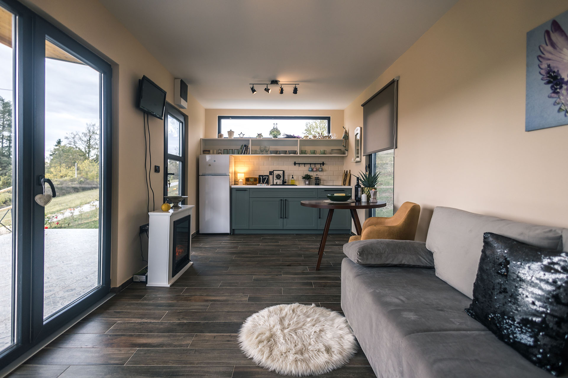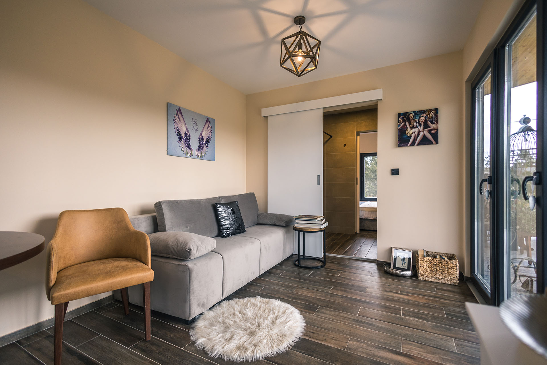Neosporni kvalitet ove vikendice je veliki natkriveni trem koji se prostire na nešto preko 30 kvadrata. Skladno opremljen, on je povezan sa unutrašnjim prostorom pomoću velikih staklenih portala.