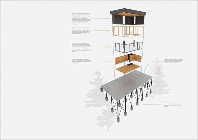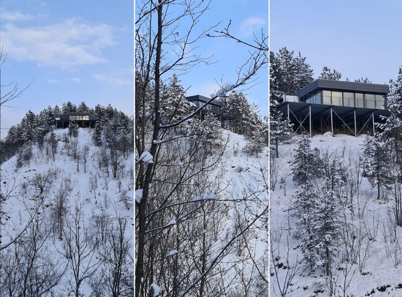 Zbog strmog i nepristupačnog terena, izgradnja kuće zahtevala je pažljivo planiranje. Međutim, upravo zbog takve pozicije objekta, oslonjena na vitke stubove, vikendica izgleda kao da lebdi nad krošnjama drveća.