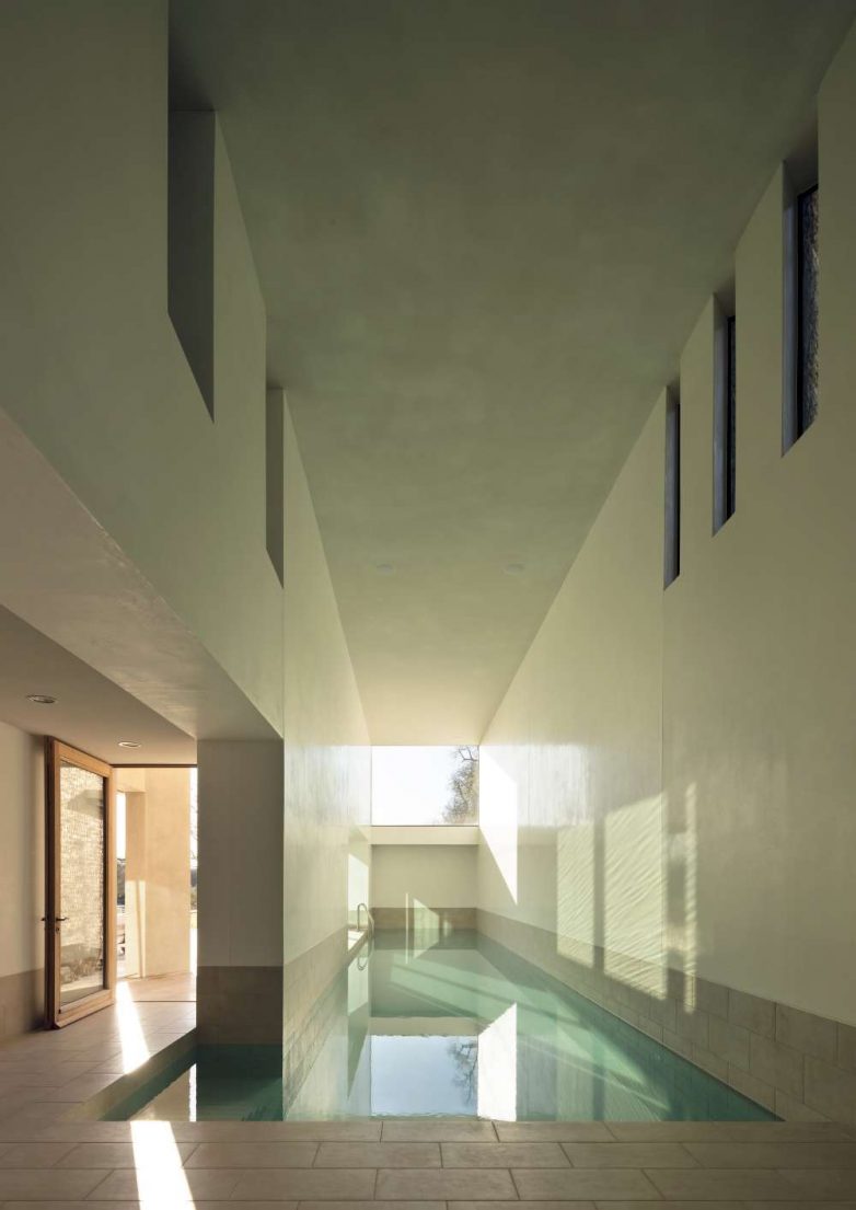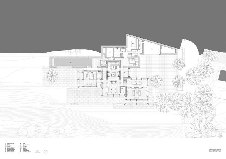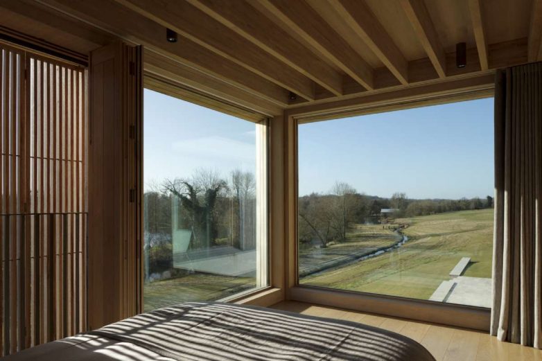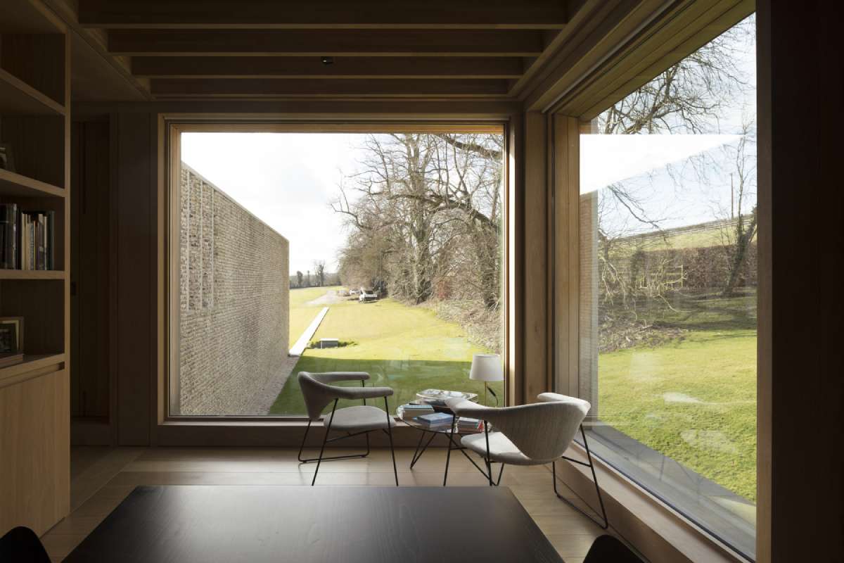 Projekat ove impozantne kuće od 1.250 metara kvadratnih potpisuje Niall McLaughlin Architects koja se sa ulaza, na izdignutom terenu, očituje kao jednospratna struktura. Međutim, spuštanjem niz uređenih drvored otvara se puni pogled na dvospratni objekat organizovan kao sistem spojenih volumena.