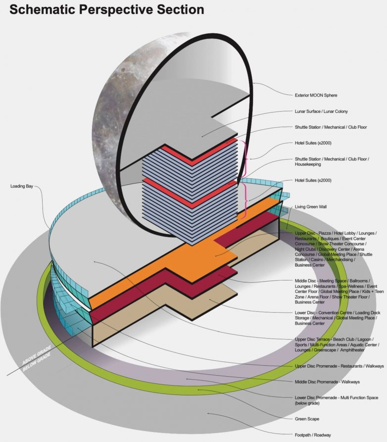 Nazvan jednostavno Moon (srp. Mesec), ovaj nesvakidašnji rizort bi se sastojao od sferične čelične konstrukcije koja zatvara hotel i atrakciju koja simulira površinu Meseca, izgrađene na dva trospratna kružna podijuma.