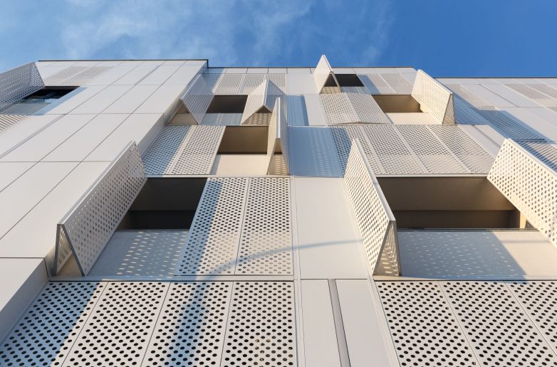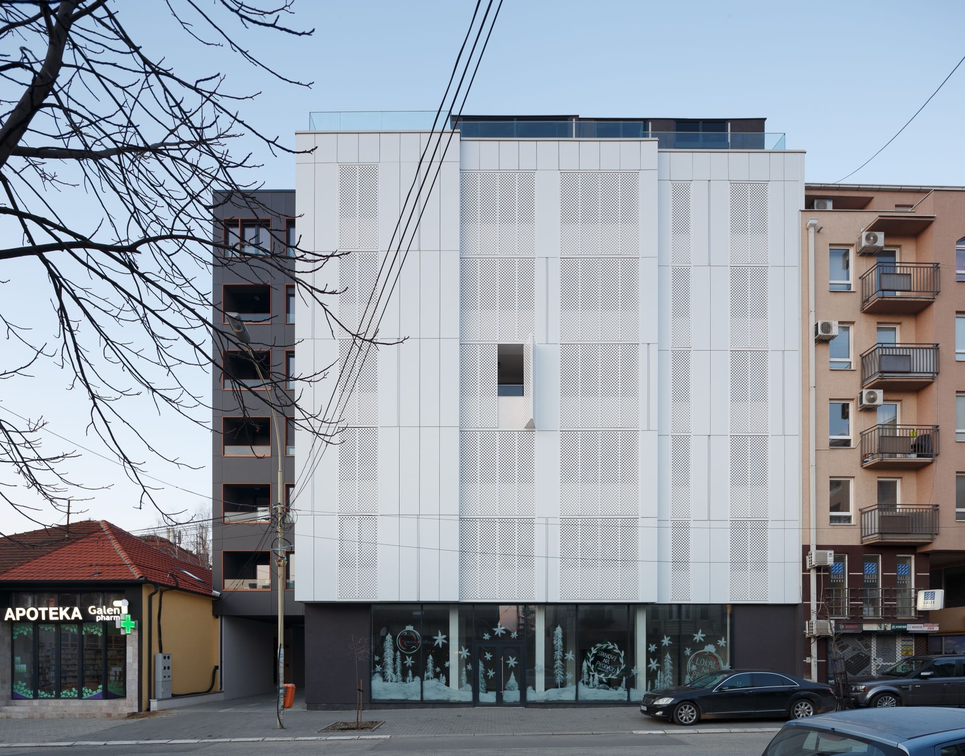 Dinamičnost bele fasadne forme ostvarena je korišćenjem perforiranih prozorskih šalona.