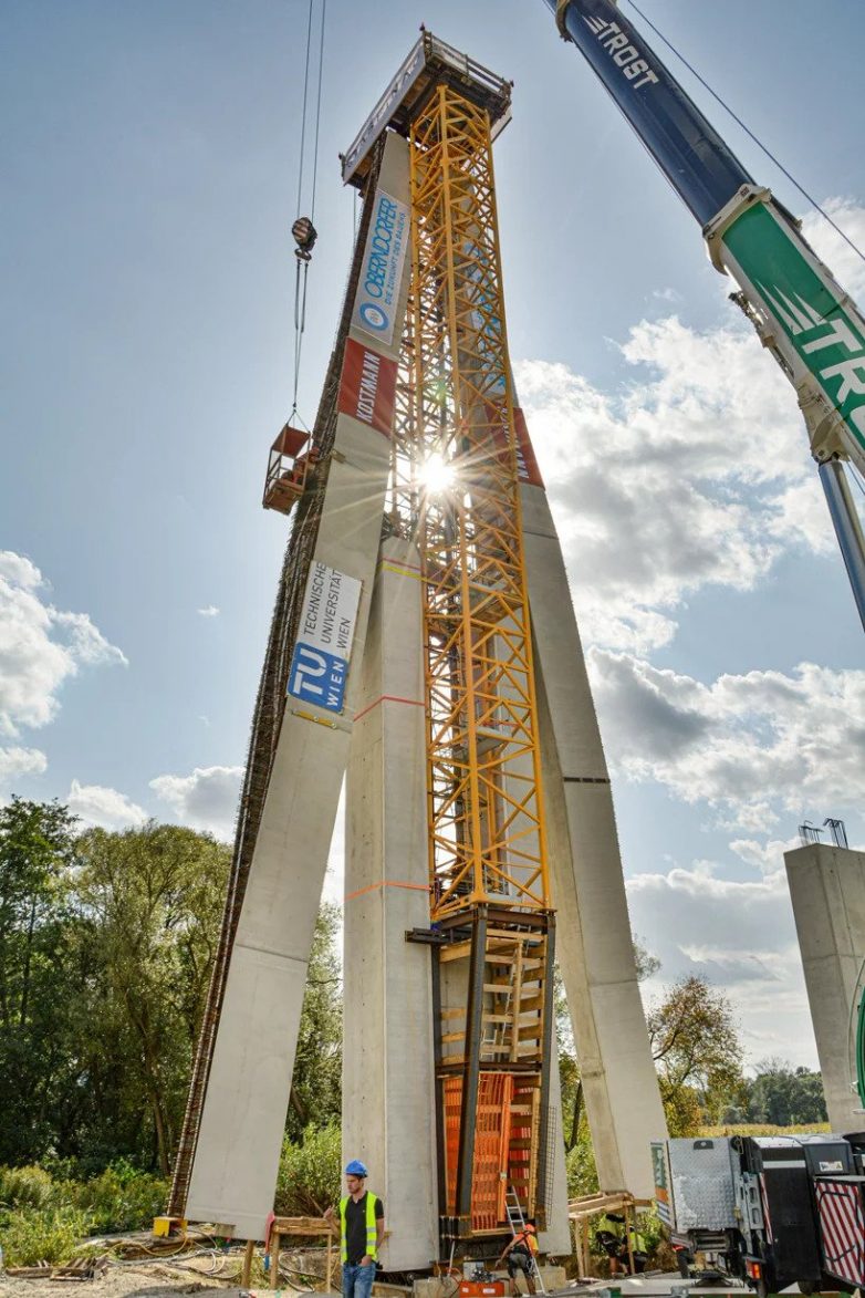 „Dve grede su povezane međusobno na vrhu, tačno iznad krana“ – objašnjava Johann Kollegger, građevinski inženjer sa TU Wien za Designboom. „Zglob se polako spušta pomoću hidrauličnog sistema, a grede se šire na obe strane.“