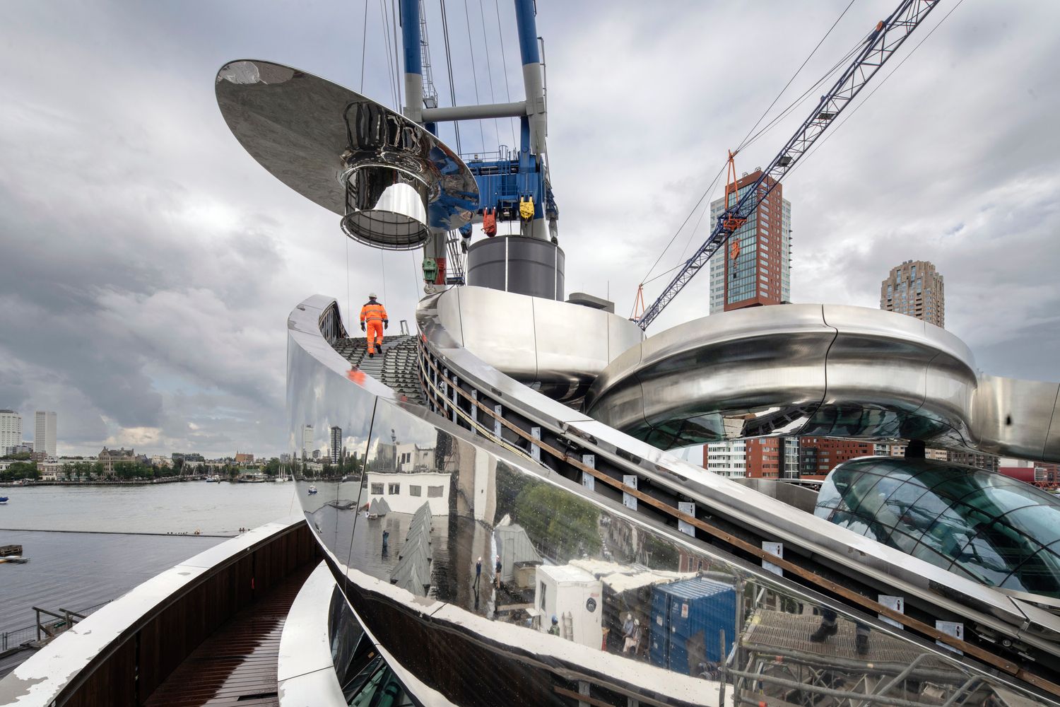 Struktura obložena sa 297 visoko poliranih panela od nerđajućeg čelika donosi se baržama, a njen proračun i montaža su pravo malo građevinsko remek-delo.