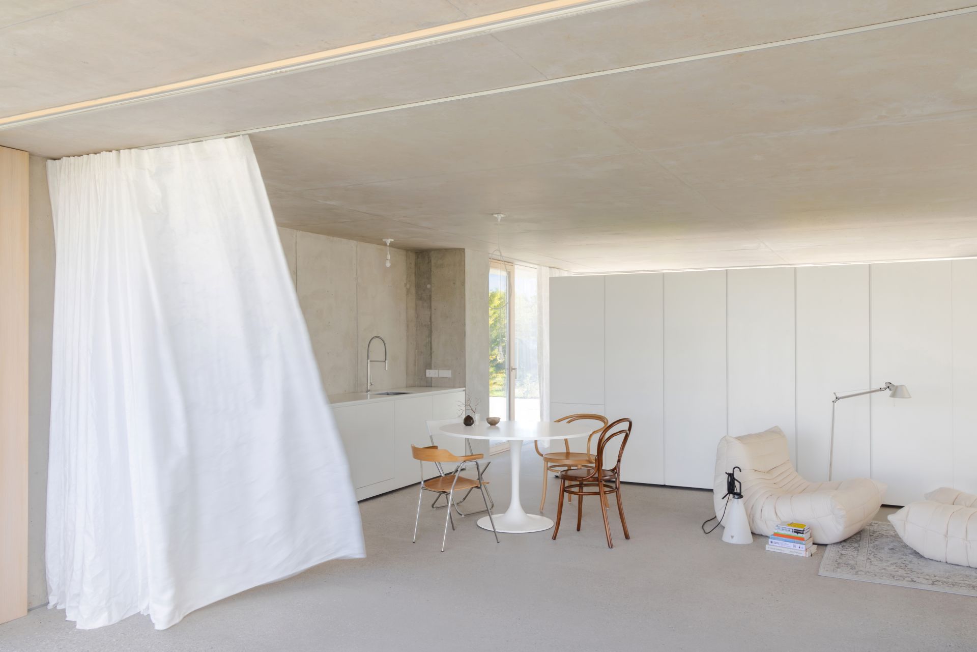 Na severozapadnom uglu, suptilni strukturni pregib na krovu stvara potpuno zastakljen ugao bez opterećenja, koji rastvara granicu između unutrašnjosti i spoljašnjosti. Veliki drveni klizni panoramski prozor na jugozapadnoj fasadi dodatno jača ovu vezu, potpuno nestajući u udubljenom čeličnom okviru i omogućavajući da se životni prostor spoji sa baštom tokom toplijih meseci.