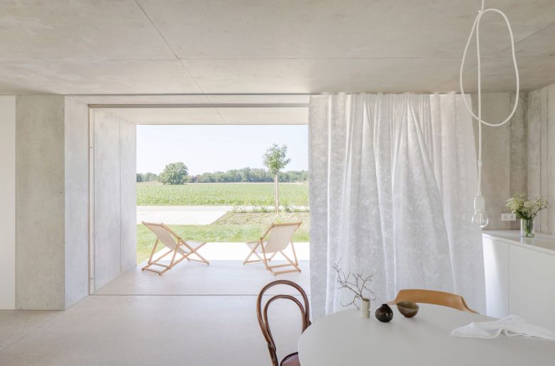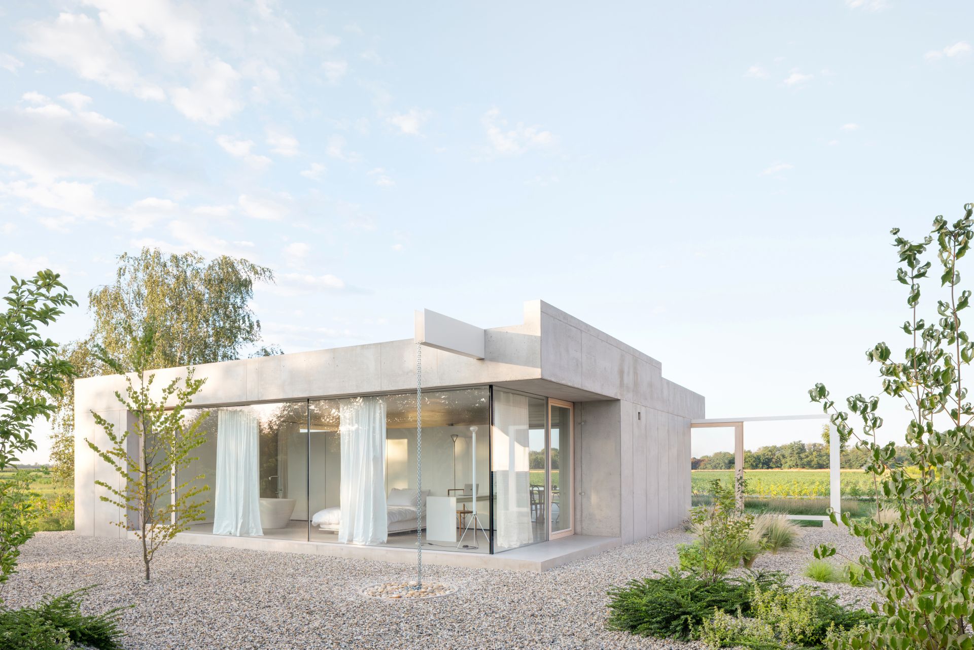 Projekat u Murskoj Soboti oslanja se na modernističko nasleđe regiona, uz veliki klizni prozor koji spaja enterijer sa pejzažom ravnice.