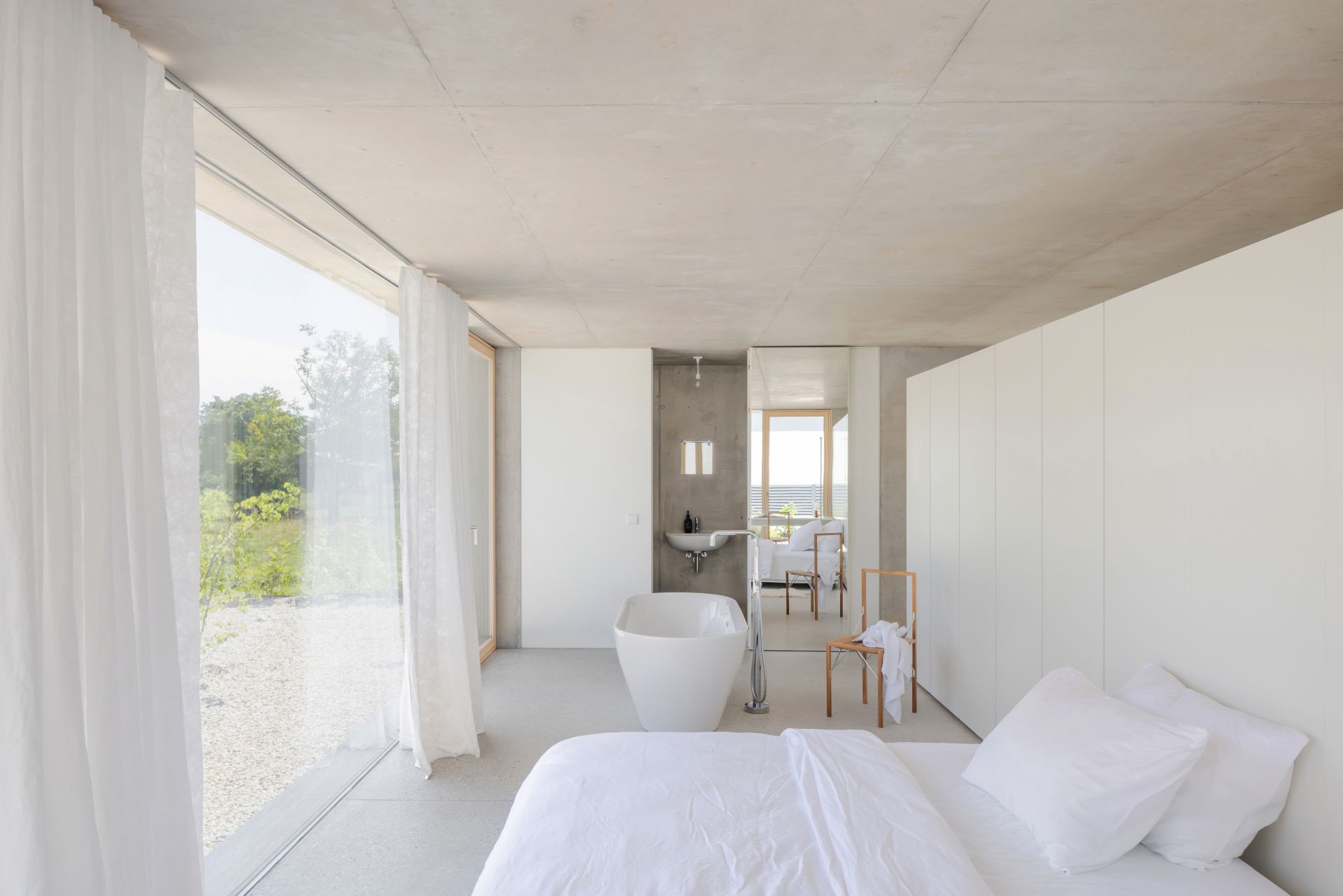 „Izloženi beton se koristi u celom spoljašnjosti i unutrašnjosti, izliven sa lokalnim šljunkom iz reke Mure kako bi površinama dao mekan, mineralan karakter. Beton zadržava tragove ponovo korišćene oplate, ostavljajući teksture, nepravilnosti i patinu koje unose osećaj vremena i nesavršenosti. Umesto da deluje kao neutralna pozadina, materijal postaje aktivni deo arhitektonskog izraza“, objašnjavaju autori.
