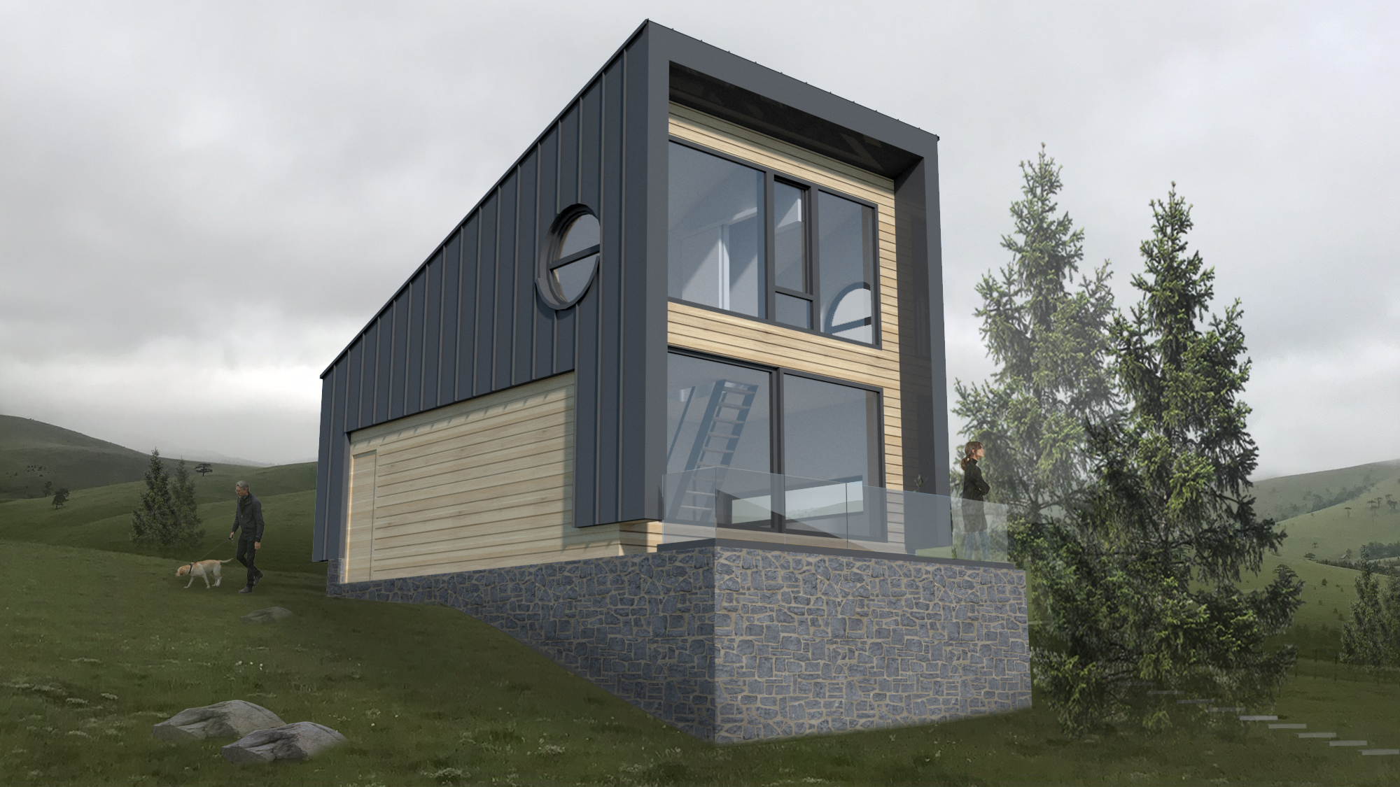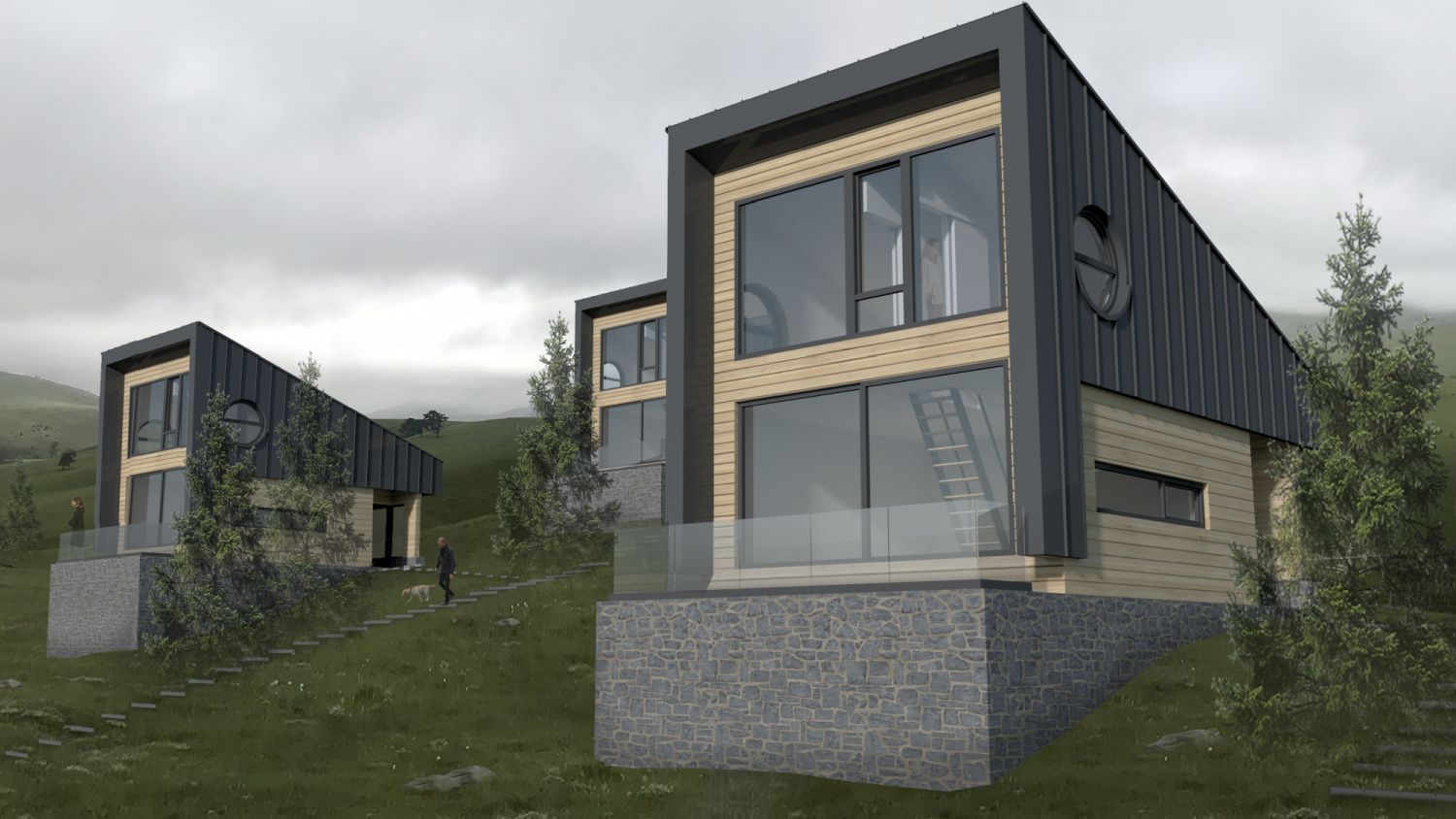 Projektni biro dizajnirao je pojedinačnu kuću s namerom da bude pojednostavljene forme, jer je ona element grupacije u specifičnom prirodnom okruženju. “To nije tipska kuća i grupacija kuća koja može da egzistira bilo gde, već je proizašla iz uticaja konkretnog lokaliteta.” – kaže Marija i dodaje da su to kuće koje izranjaju iz zemlje, kao periskopi koji izranjaju iz vode i upijaju prirodu. Koncipirane su u funkciji doživljaja prirode i velikim staklenim portalom orijentisane ka pejzažu i pogledu.
