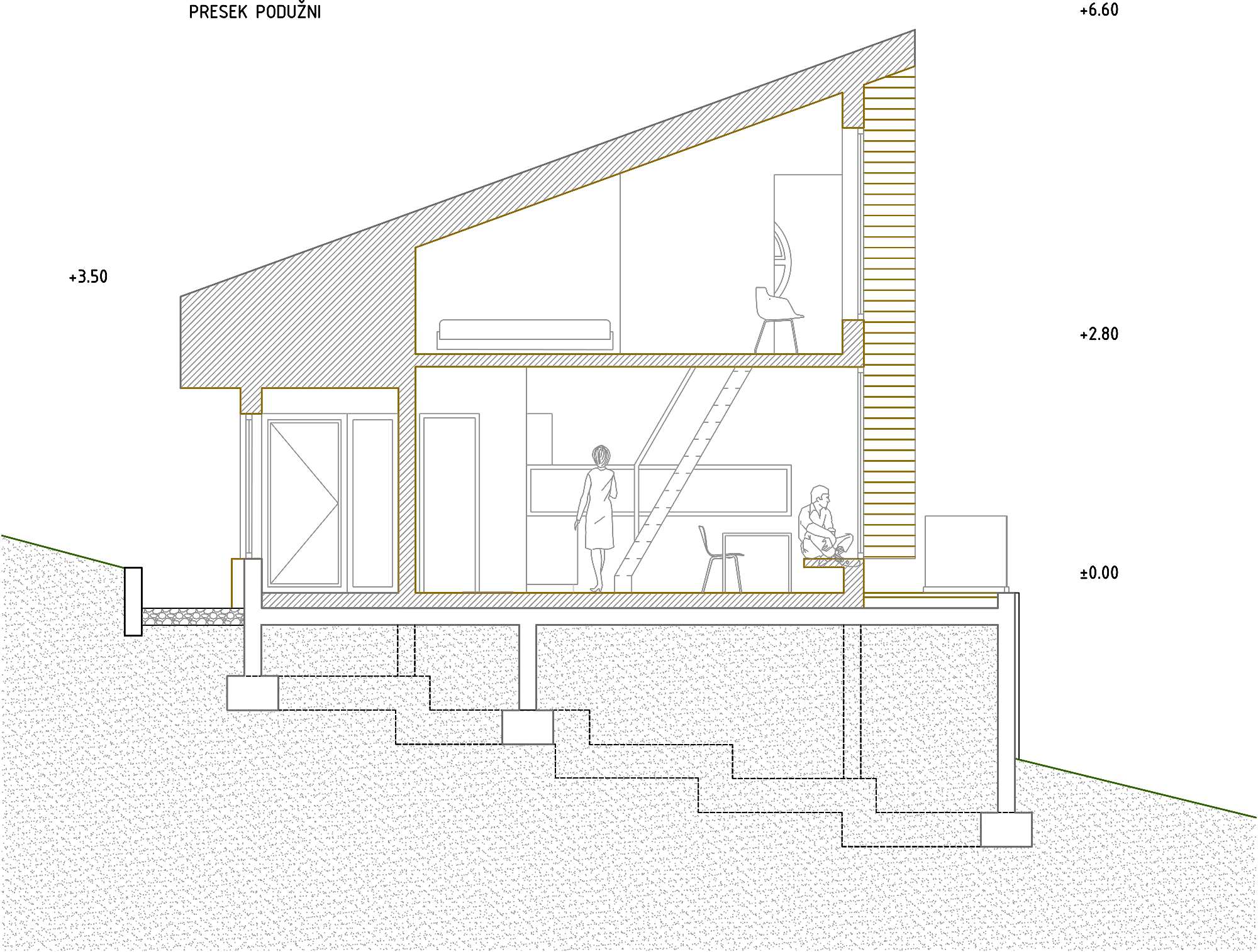 Prizemlje sadrži natkriveni ulazni trem, vetrobran, kupatilo, jednoprostornu dnevnu zonu (kuhinja, trpezarija, dnevna soba), i delimično natkrivenu terasu. Između dnevne zone i terase celom dužinom prozorskog portala projektovana je klupa za sedenje i relaksaciju. Brodskim stepenicama prizemlje je povezano sa potkrovljem gde su smeštene dve spavaće sobe. U prizemlju je projektovana i ostava u koju se ulazi spolja. Glavna orijentacija dnevne zone i noćne zone je prema istoku.